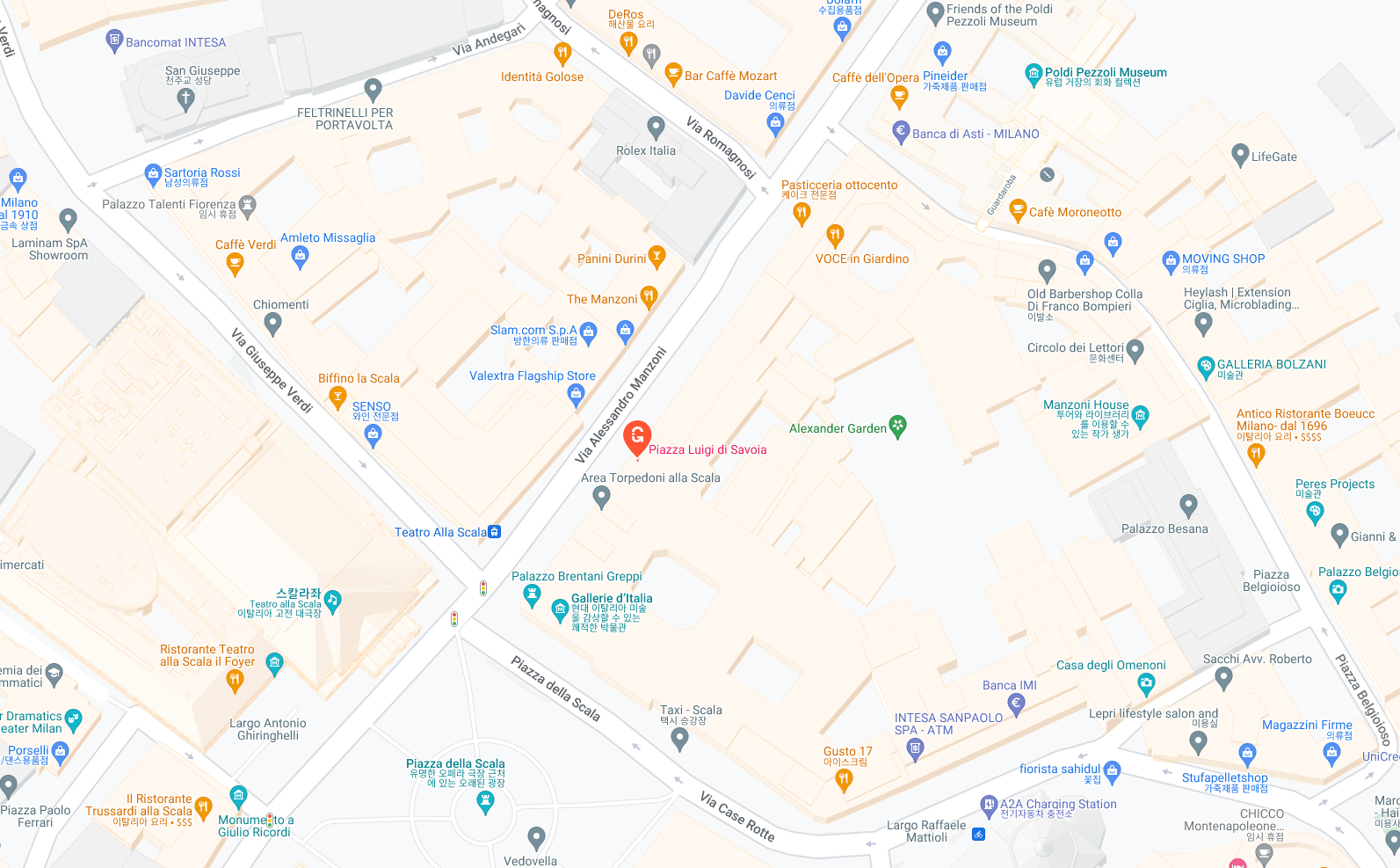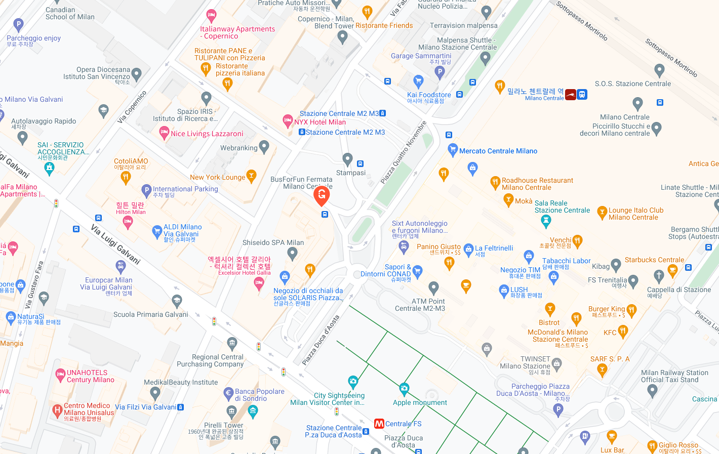 스칼라 광장에서 100m, 두오모 광장에서 400m 떨어진 Via Alessandro Manzoni 4의 버스 정류장에서 만납니다.