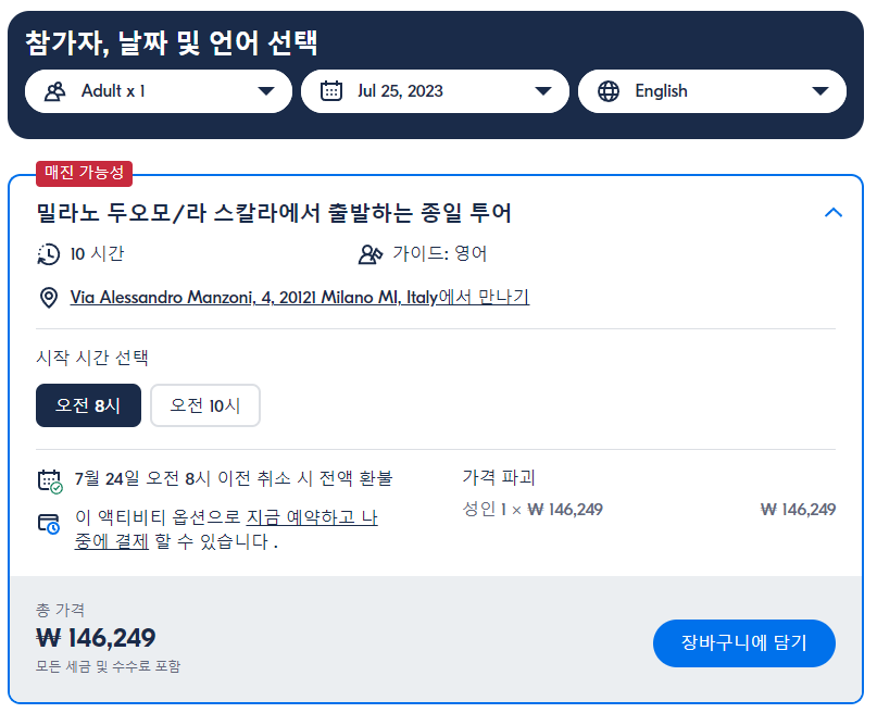 미팅 포인트는 예약한 옵션에 따라 다를 수 있습니다.