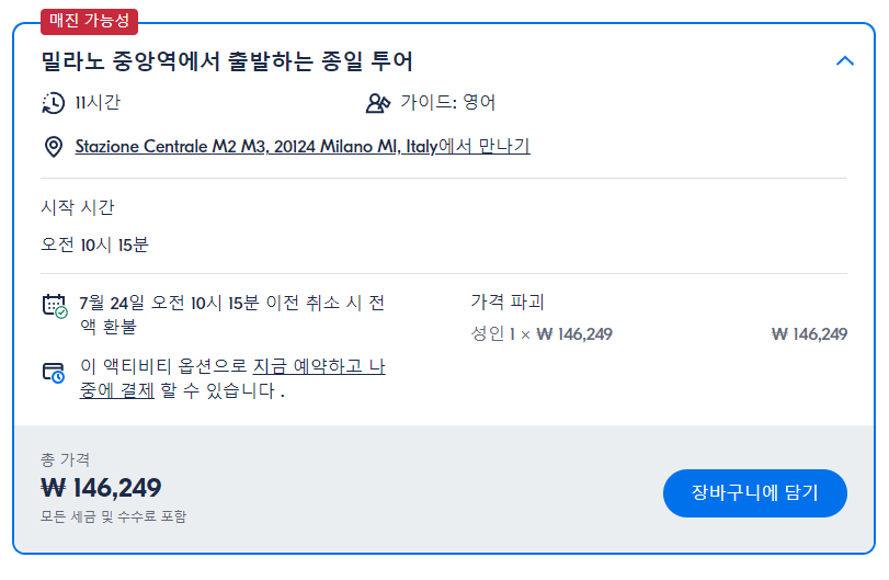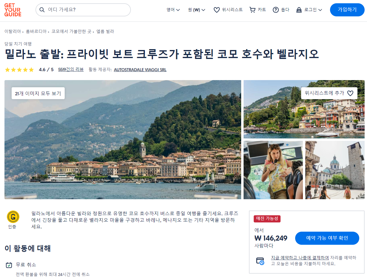 밀라노출발 프라이빗 보트 크루즈가 포함된 코모 호수와 벨라지오 (Lake Como and Bellagio with Private Boat Cruise From Milan) 현지투어는 GET YOUR GUIDE 사이트에서 예약하실 수 있습니다. 사이트는 특히 전세계 대부분의 나라, 지역의 투어, 교통편 있어, 쉽게 찾을 수 없는 여행지의 다양한 투어 및 서비스를 이용할 수 있는 글로벌 사이트로 한국어사이트는 지원하지 않습니다. (글로벌 한국어 여행사이트를 찾으신다면 klook 여행사이트 추천합니다. 함께 사용하시면 더욱 편하게 여행하실 수 있습니다. klook에 찾는 정보가 없다면 GET YOUR GUIDE에서 찾으시면 됩니다.)