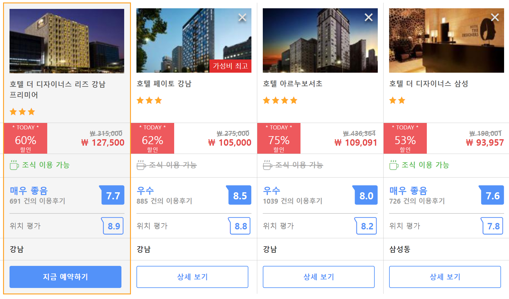 호텔 더 디자이너스 리즈 강남 프리미어 (Hotel The Designers LYJ Gangnam Premier)의 의 최저 가격대는 아고다에서 할인특가 가격으로 매일매일 변동되며 20만원대부터 다양하게 형성됩니다. 아고다 최저가를 확인하시려면 아래 링크를 누르시면 원하는 날짜의 가격대를 자세히 보실 수 있습니다.