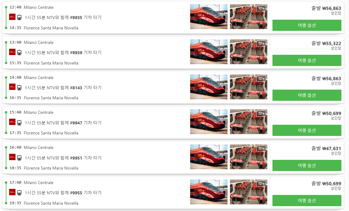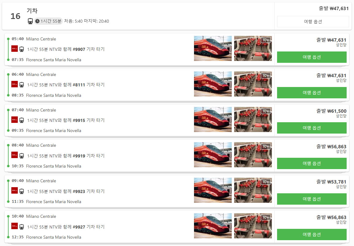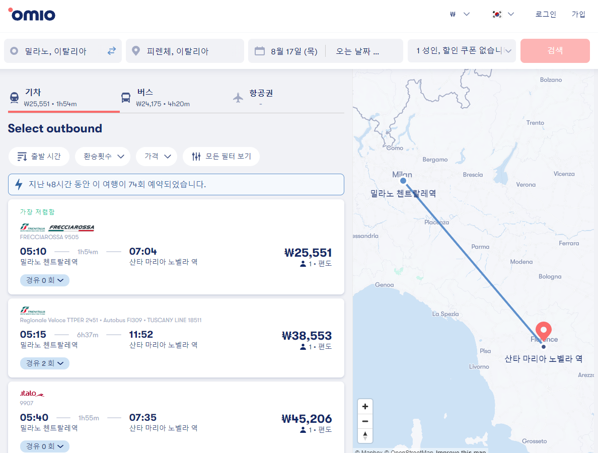 이탈리아 밀라노에서 피렌체로 이동하는 교통편은 12go사이트를 비롯해 omio 사이트를 함께 비교해서 가성비 좋은 교통편을 이용하시는 것이 좋습니다.