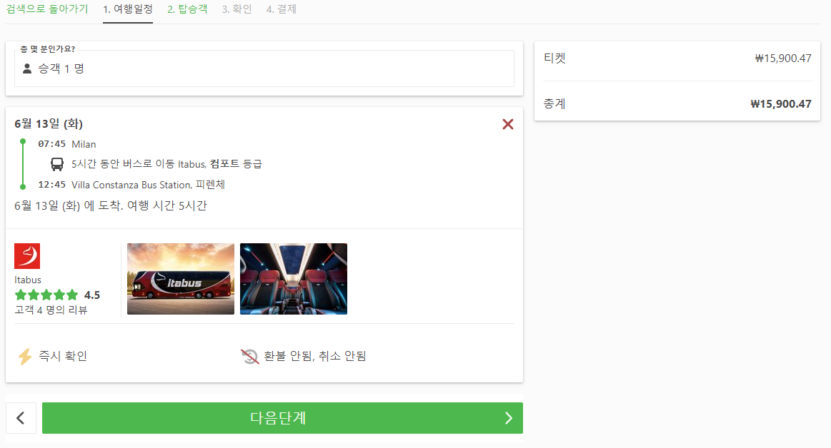 밀라노에서 피렌체로 가는 교통편은 노선정보 및 예약은 12go사이트에서 예약하실 수 있으며, 이 노선 뿐만아니라 나라전역의 노선, 나라간 노선의 검색가능한 모든 교통편을 검색하고 예약하실 수 있습니다. 한국어로 검색해보시고 나오지 않으면 영어로 검색하시면 보다 쉽게 노선을 확인하실 수 있습니다.