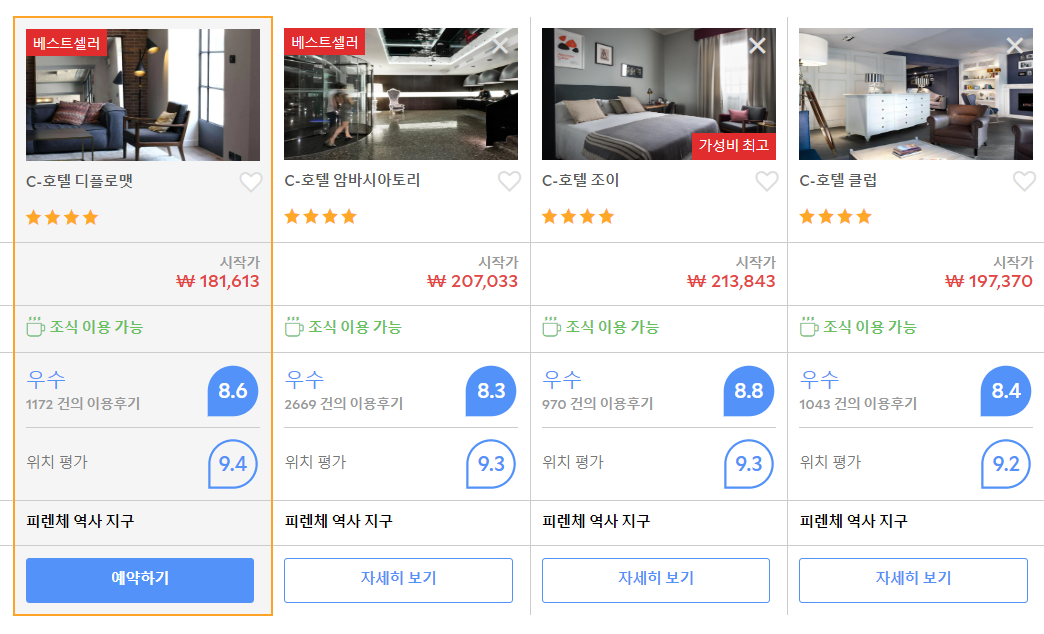 피렌체 C-호텔 디플로맷 (C-Hotels Diplomat)의 최저 가격대(1박당 요금 - 세금 및 봉사료 포함)는 아고다웹사이트에서 할인특가 가격으로 매일매일 변동되며 10만원대부터 다양하게 형성됩니다. 날짜별로 매일 가격이 다르므로 아고다웹사이트 최저가를 확인하시려면 아래 링크를 누르시고 원하는 날짜의 가격대를 선택해야 정확한 가격을 자세히 보실 수 있습니다.