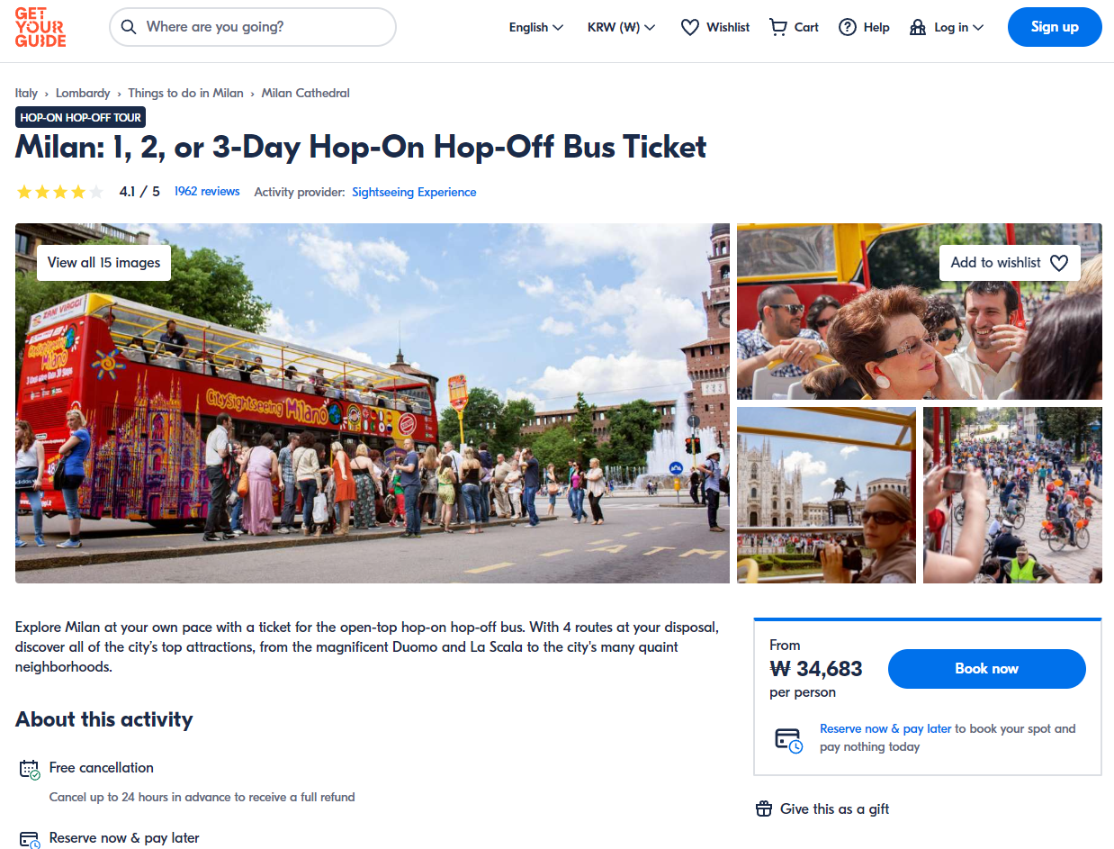 밀라노투어버스(Milan Hop On Hop Off Bus) 티켓은 GET YOUR GUIDE 사이트에서 예약하실 수 있습니다. 사이트는 특히 전세계 대부분의 나라, 지역의 투어, 교통편 있어, 쉽게 찾을 수 없는 여행지의 다양한 투어 및 서비스를 이용할 수 있는 글로벌 사이트로 한국어사이트는 지원하지 않습니다. (글로벌 한국어 여행사이트를 찾으신다면 klook 여행사이트 추천합니다. 함께 사용하시면 더욱 편하게 여행하실 수 있습니다. klook에 찾는 정보가 없다면 GET YOUR GUIDE에서 찾으시면 됩니다.)