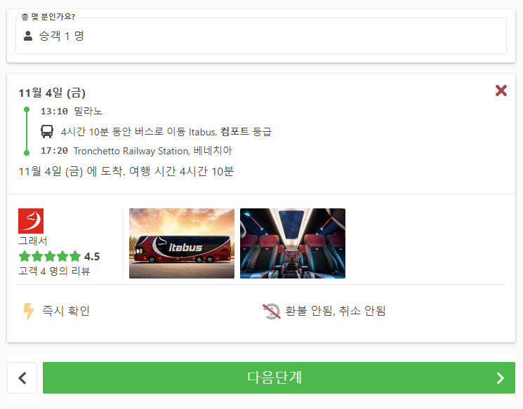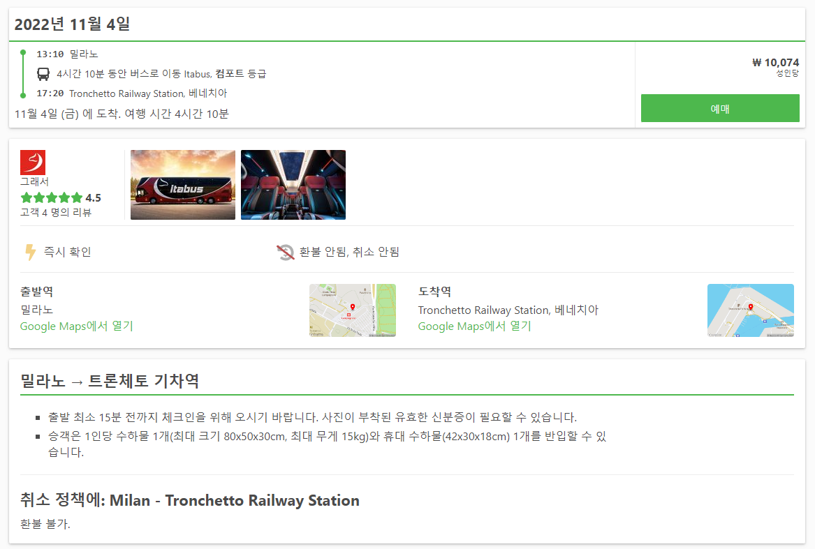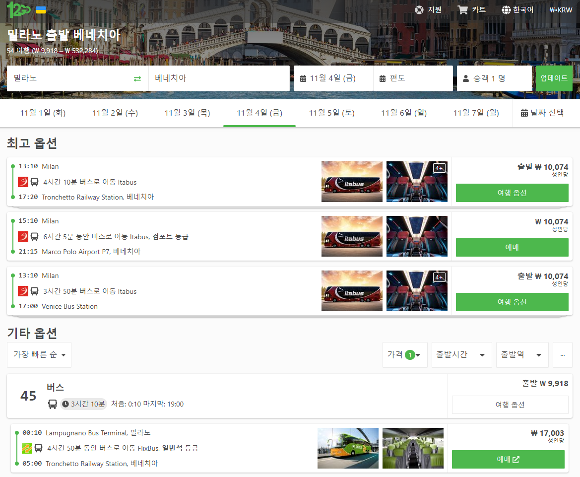 밀라노에서 베네치아로 가는 교통편 노선정보 및 예약은 12go사이트에서 예약하실 수 있으며, 이 노선 뿐만아니라 나라전역의 노선을 검색하고 예약하실 수 있습니다. 한국어로 검색해보시고 나오지 않으면 영어로 검색하시면 보다 쉽게 노선을 확인하실 수 있습니다.