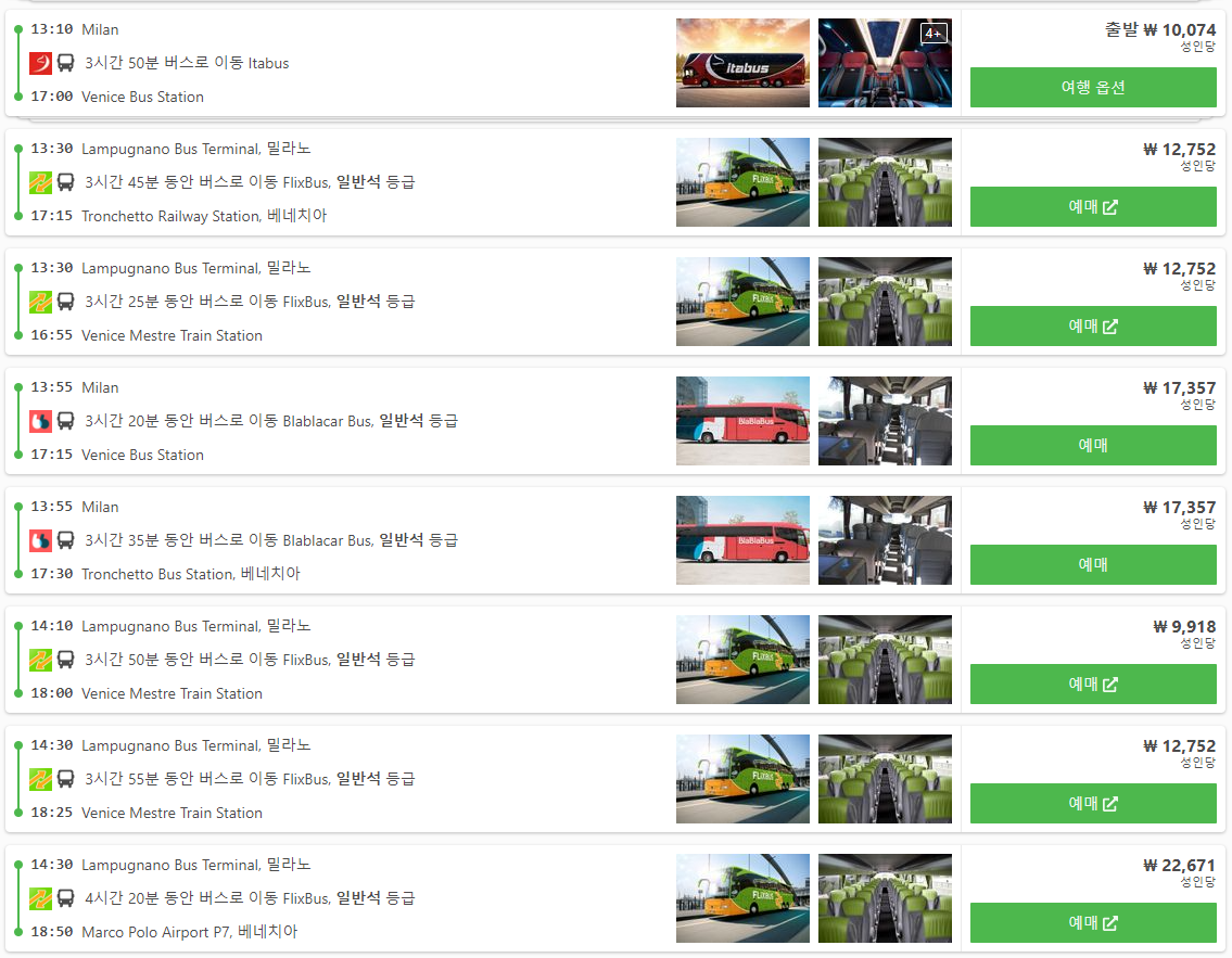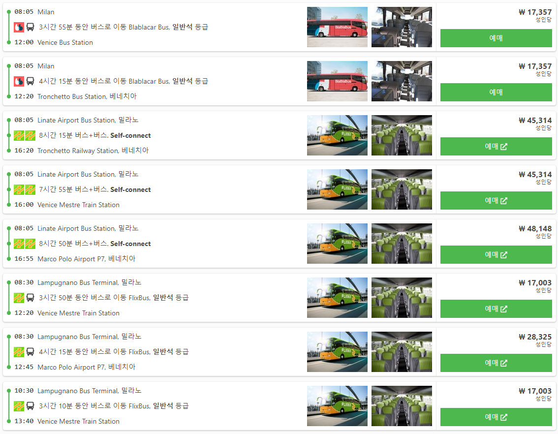 밀라노에서 베네치아로 가는 버스는 직행은 3~4시간대, 경유하는 버스는 7~8시간대로 self-connect라고 되어 있으면 경유버스인 만큼 주의해서 예약하셔야합니다. 타는곳과 내리곳도 다양한 만큼 예약한 호텔 등 위치를 고려하여 선택하시면됩니다. 버스회사는 Itabus, FlixBus, Blablacar Bus 가 있습니다.