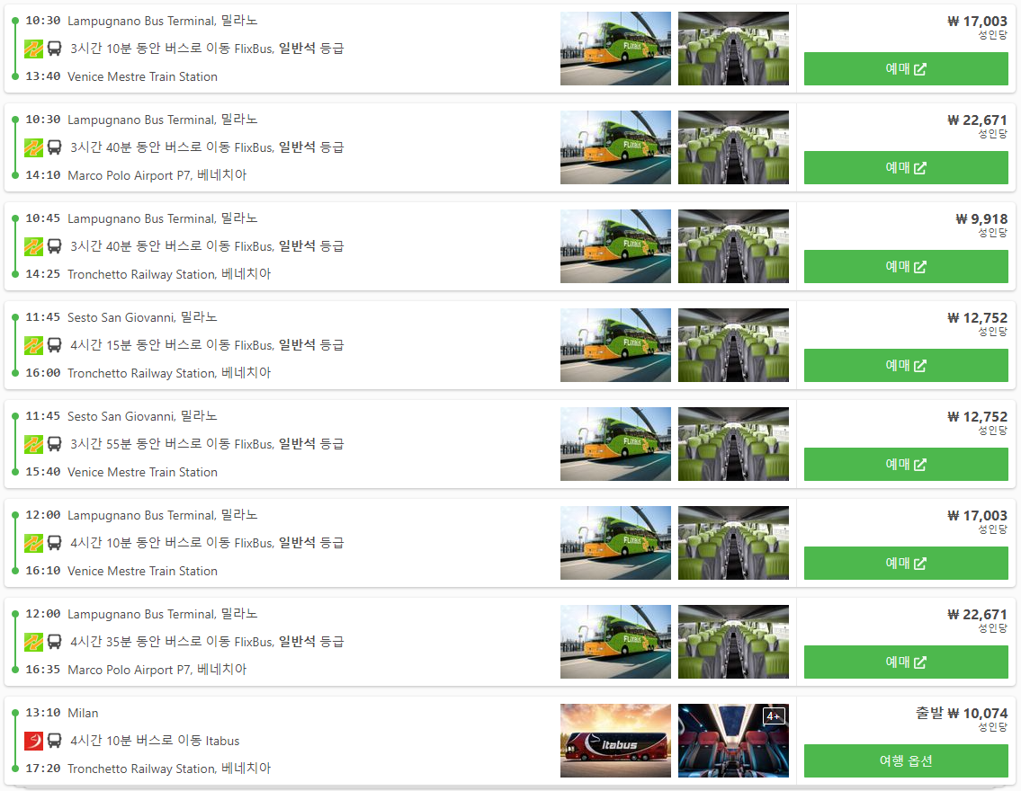 이탈리아 밀라노에서 베네치아(베니스)로 이동하는 방법으로는 버스나 항공을 이용하실 수 있으며 버스의 경우 1~ 4만원대, 이동시간은 3시간 10분 ~ 8시간대까지 다양합니다. 항공의 경우 10만원대에 이용하실 수 있지만, 코로나로 노선복구가 안되어 있는지 아직은 경유노선만 검색이 되어 3~4시간 정도 소요됩니다. 아직은 비용이나, 시간이나 모든 면에서 버스교통편이 유용합니다.