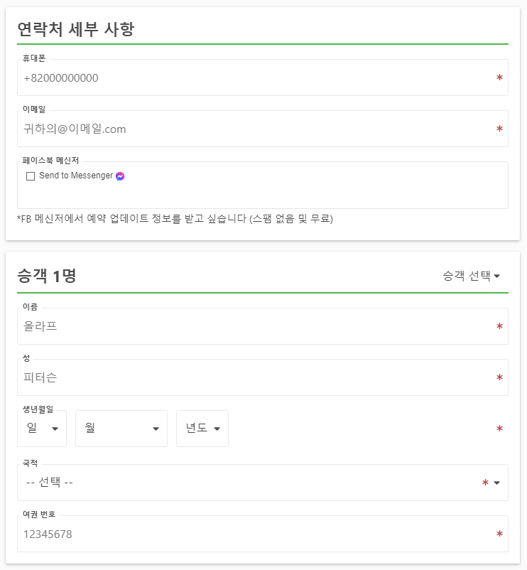 온라인사이트 예약시에는 휴대폰, 이메일, 이름, 성, 생년월일, 국적, 여권번호를 입력하고 여행자보험은 선택사항입니다.