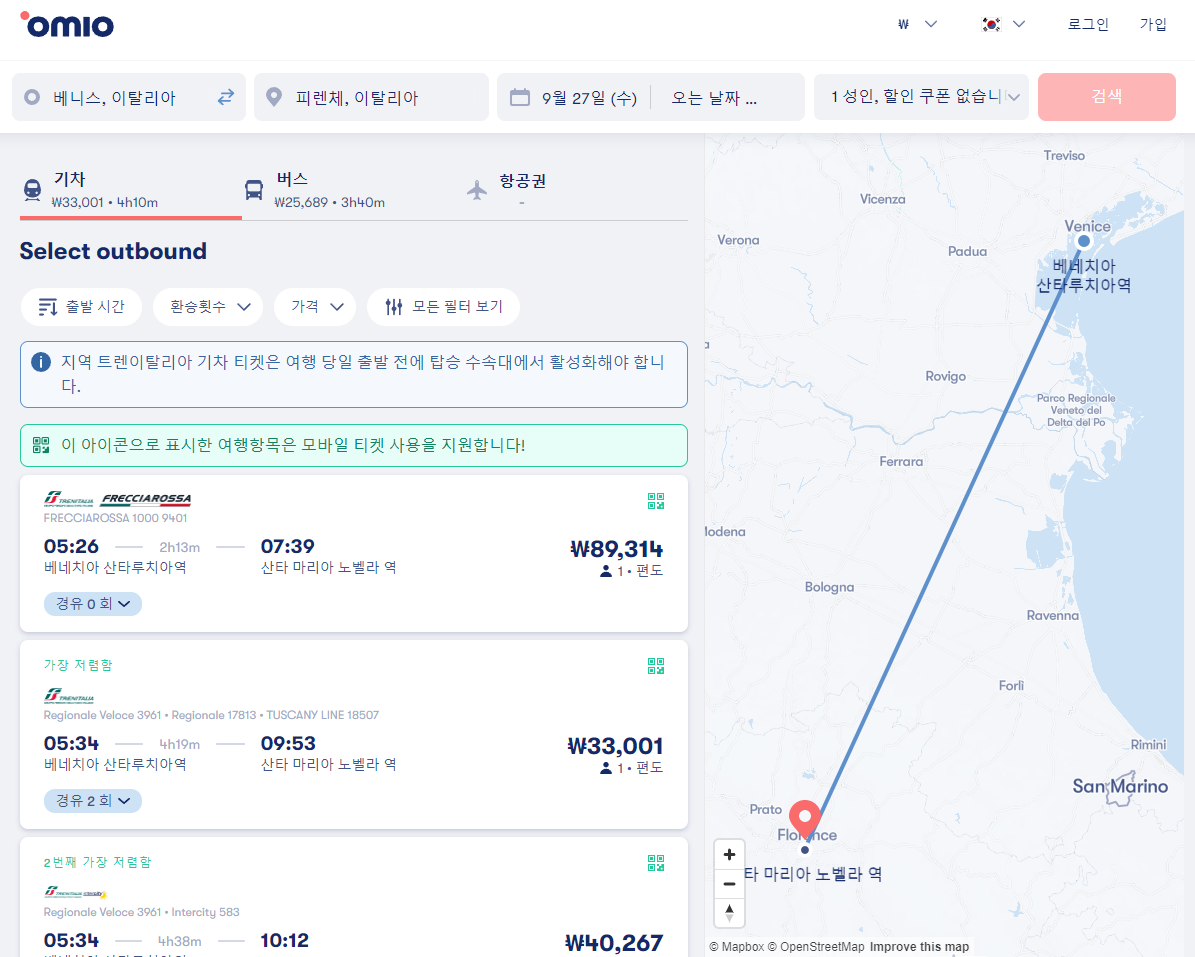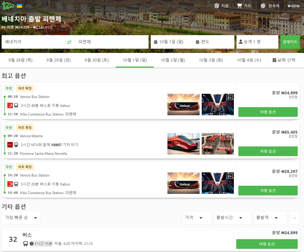 베니스(Venezia)에서 피렌체(Firenze)로 이동하는 교통편 노선정보 및 예약은 12go사이트와 omio 사이트에서 예약하실 수 있으며, 이 노선 뿐만아니라 나라전역의 노선, 나라간 노선의 검색가능한 모든 교통편을 검색하고 예약하실 수 있습니다. 한국어로 검색해보시고 나오지 않으면 영어로 검색하시면 보다 쉽게 노선을 확인하실 수 있습니다. 사이트를 함께 비교해서 가성비 좋은 교통편을 이용하시는 것이 좋습니다.