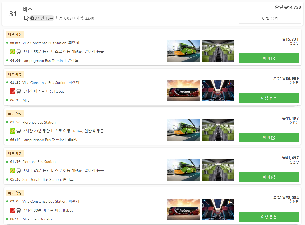 피렌체에서 밀라노로 가는 버스는 가장빠른 이동시간이 3시간 15분정도이며 최저요금은 1만원대입니다. 타고 내리는 터미널 또는 정류장은 지명만으로는 잘 모르고 예매를 눌러 다음페이지보시면 지도와 함께 정확한 위치를 확인하실 수 있습니다. 피렌체에서 밀라노로 이동하는 버스노선은 하루 평균 30편정도 하루종일 운행하는 만큼 타고 내리는 위치와 요금을 비교해서 잘 선택하시는 것이 좋습니다. 피렌체에서 밀라노로 가는 버스는 다양한 교통편중 가장 저렴한 교통편입니다.