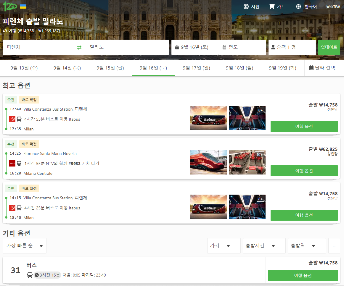 피렌체에서 밀라노로 이동하는 교통편은 유명한 12go사이트를 비롯해 스카이스캐너, omio 사이트를 함께 비교해서 가성비 좋은 교통편을 이용하시는 것이 좋습니다.