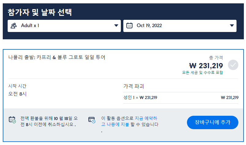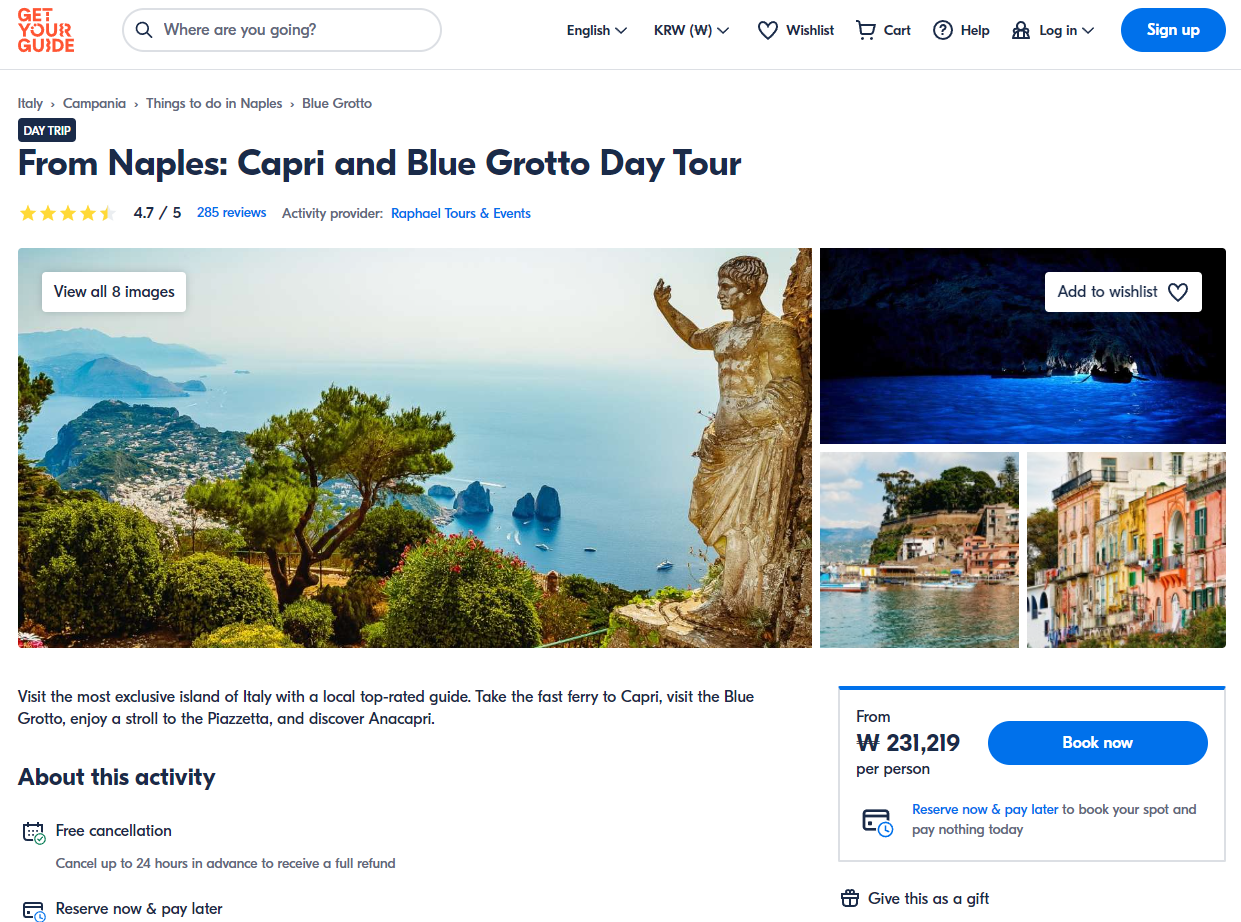 나폴리출발 카프리와 블루 그로토 일일 투어는 GET YOUR GUIDE 사이트에서 예약하실 수 있습니다. 사이트는 특히 전세계 대부분의 나라, 지역의 투어, 교통편 있어, 쉽게 찾을 수 없는 여행지의 다양한 투어 및 서비스를 이용할 수 있는 글로벌 사이트로 한국어사이트는 지원하지 않습니다. (글로벌 한국어 여행사이트를 찾으신다면 klook 여행사이트 추천합니다. 함께 사용하시면 더욱 편하게 여행하실 수 있습니다. klook에 찾는 정보가 없다면 GET YOUR GUIDE에서 찾으시면 됩니다.)