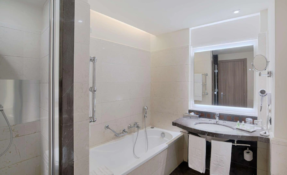 일부 객실의 욕실 내에 제공되는 타월, 세면도구, 목욕 가운 및 헤어 드라이어와 함께 상쾌하고 청결한 모습을 유지하실 수 있습니다.