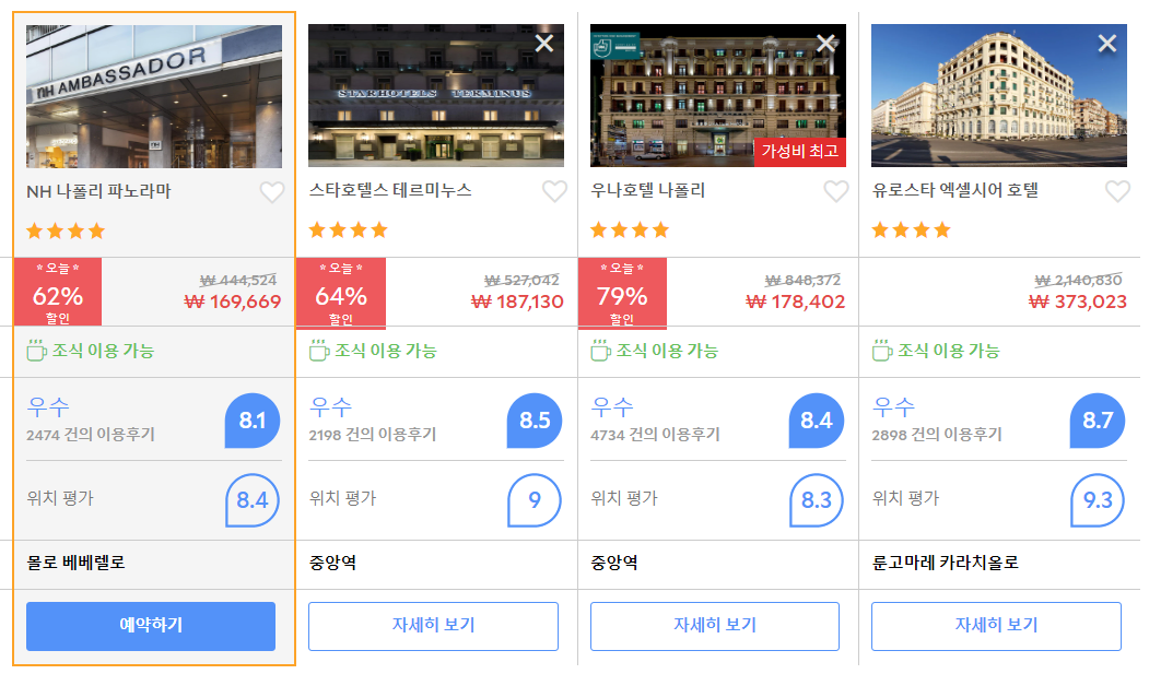NH 나폴리 파노라마 호텔 (NH Napoli Panorama)의 최저 가격대(1박당 요금 - 세금 및 봉사료 포함)는 아고다웹사이트에서 할인특가 가격으로 매일매일 변동되며 10만원대부터 다양하게 형성됩니다. 날짜별로 매일 가격이 다르므로 아고다웹사이트 최저가를 확인하시려면 아래 링크를 누르시고 원하는 날짜의 가격대를 선택해야 정확한 가격을 자세히 보실 수 있습니다.