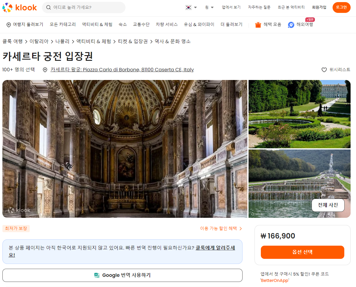 카세르타 궁전 입장권은 클룩사이트에서 쉽게 예약하실 수 있으며, 현재 할인된 금액에 이용하실 수 있습니다.