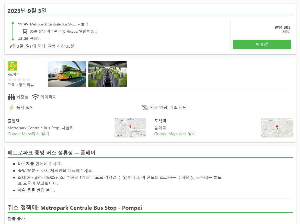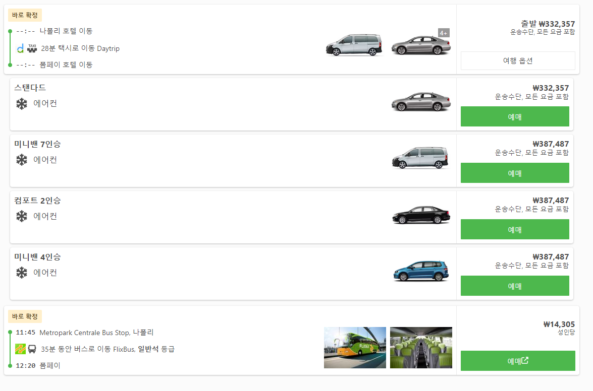 나폴리에서 폼페이로 이동하는 버스는 Metropark Centrale(나폴리역근처) 버스정류장에서 출발하며 폼페이시내 정류장에서 내리며 폼페이역과 그리 멀지 않습니다. 나폴리에서 폼페이로 가는 버스의 요금은 14,305원이며 이동시간은 35분정도입니다. 참고로 나폴리 호텔에서 폼페이호텔로 이동하는 택시 교통편은 30만원대로 승용차, 미니밴 4인승, 미니밴 7인승 등도 온라인으로 예약이 가능합니다. 예약사이트는 아래쪽에 있습니다.