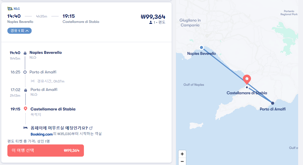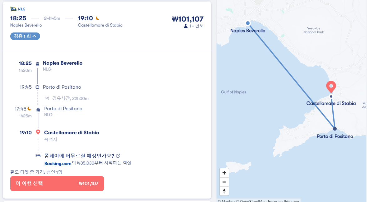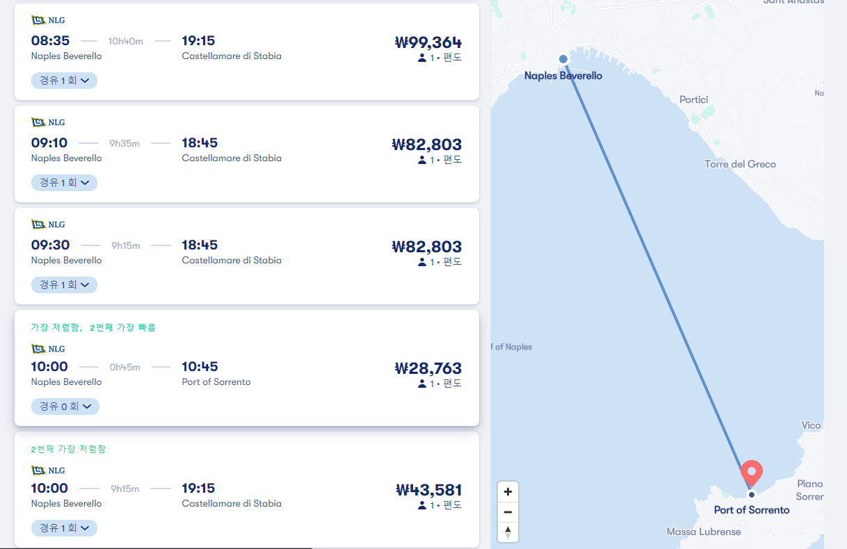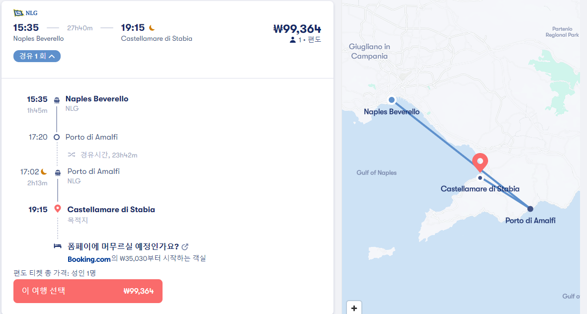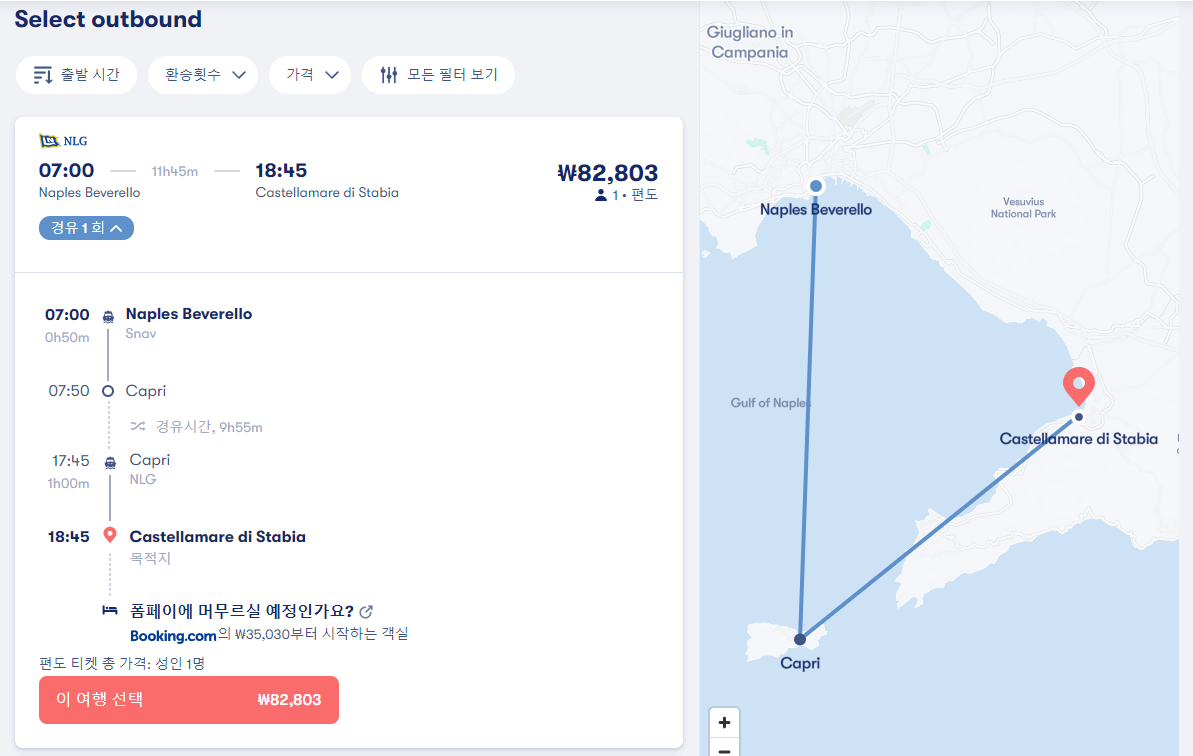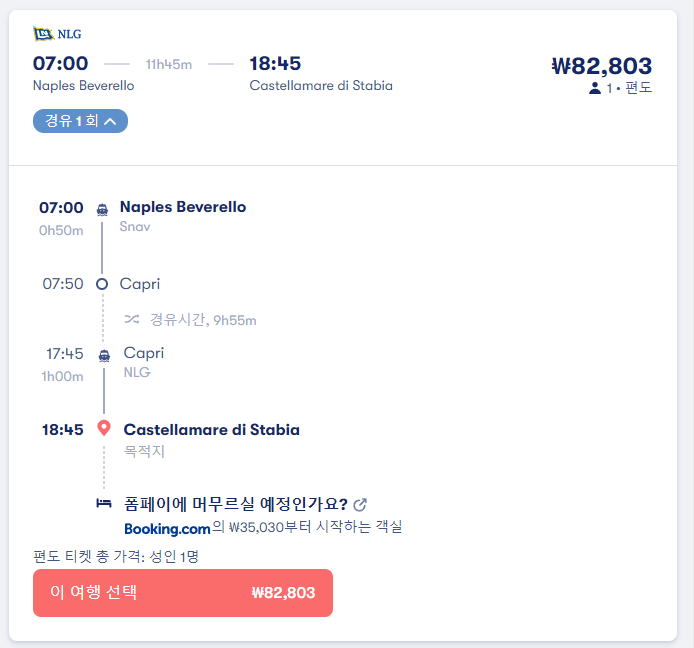 나폴리에서 폼페이로 이동하는 페리는 폼페이 시내가 아닌 castellamare di stabia 항구까지 이동하는 교통편으로 직항은 없습니다. 제일 빠른 경유노선은 나폴리에서 카프리를 거쳐 25분경유하고 castellamare di stabia로 가는 노선으로 총 이동시간은 2시간 15분이며 나폴리 beverello 선착장에서 출발하는 16시 30분 출발 NLG 회사 페리입니다. 요금은 86,374원입니다. 참고로 나폴리 beverello 선착장에서 소렌토 항구로 이동하는 페리는 이동시간 35분 요금 28,791원이며 여행계획을 잘세우셔서 나폴리 - 소렌토 - 폼페이 이런식으로 여행하시면 좀더 저렴하게 교통비를 아낄 수 있습니다. 소렌토에서 폼페이로 이동하는 버스는 4,281원에 예약하실 수 있습니다. 아래쪽 제가 알려드리는 2개의 사이트를 이용하시면 온라인 예약으로 쉽게 여행을 준비하실 수 있습니다.