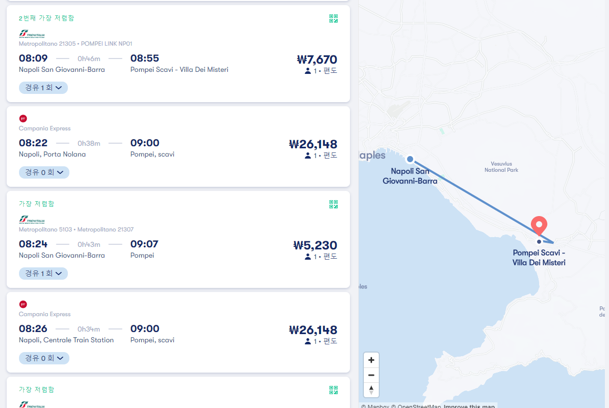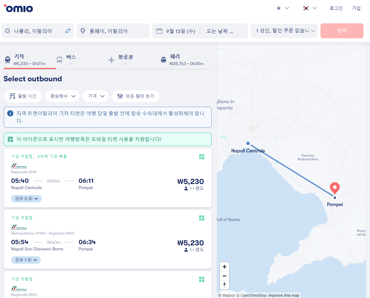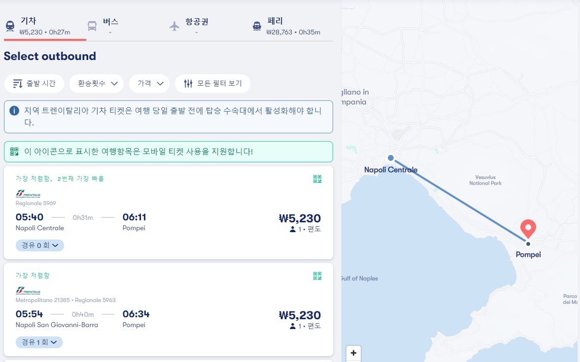 나폴리에서 폼페이로 이동하는 기차는 나폴리 센트럴역에서 폼페이역으로 이동하며 30~ 40분정도 소요되며 경유노선의 경우 더 걸릴 수 있습니다. 검색결과에서 경유 0이라고 표시된 것이 바로가는 노선입니다. 기차는 새벽 5시 40분부터 22시 05분까지 다양하며 경유인지 아닌지만 잘 확인하시면 될것 같습니다. 요금은 5,235원입니다.