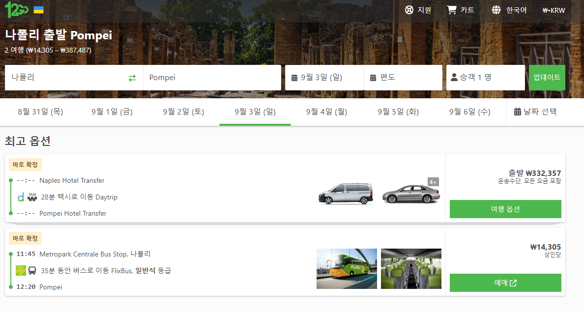 나폴리에서 폼페이로 가는 교통편 노선정보 및 예약은 12go사이트와 OMIO사이트에서 예약하실 수 있으며, 이 노선 뿐만아니라 나라전역의 노선, 나라간 노선의 검색가능한 모든 교통편을 검색하고 예약하실 수 있습니다. 한국어로 검색해보시고 나오지 않으면 영어로 검색하시면 보다 쉽게 노선을 확인하실 수 있습니다. 이노선은 버스 12go사이트, 기차와 페리 OMIO사이트에서 검색 및 예약하실 수 있습니다.