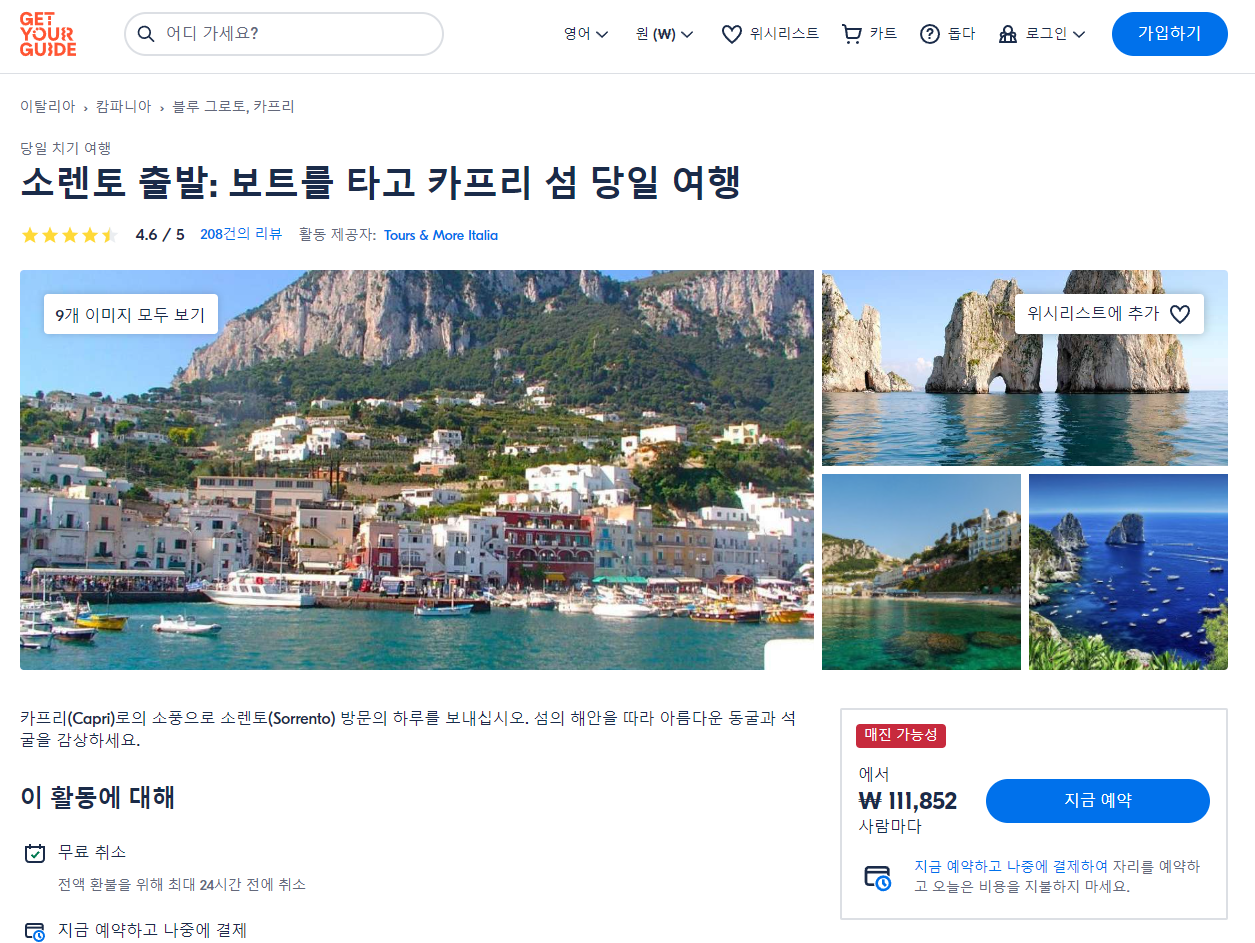 소렌토출발 보트를 이용한 카프리섬 당일투어는 GET YOUR GUIDE 사이트에서 예약하실 수 있습니다. 사이트는 특히 전세계 대부분의 나라, 지역의 투어, 교통편 있어, 쉽게 찾을 수 없는 여행지의 다양한 투어 및 서비스를 이용할 수 있는 글로벌 사이트로 한국어사이트는 지원하지 않습니다. (글로벌 한국어 여행사이트를 찾으신다면 klook 여행사이트 추천합니다. 함께 사용하시면 더욱 편하게 여행하실 수 있습니다. klook에 찾는 정보가 없다면 GET YOUR GUIDE에서 찾으시면 됩니다.)