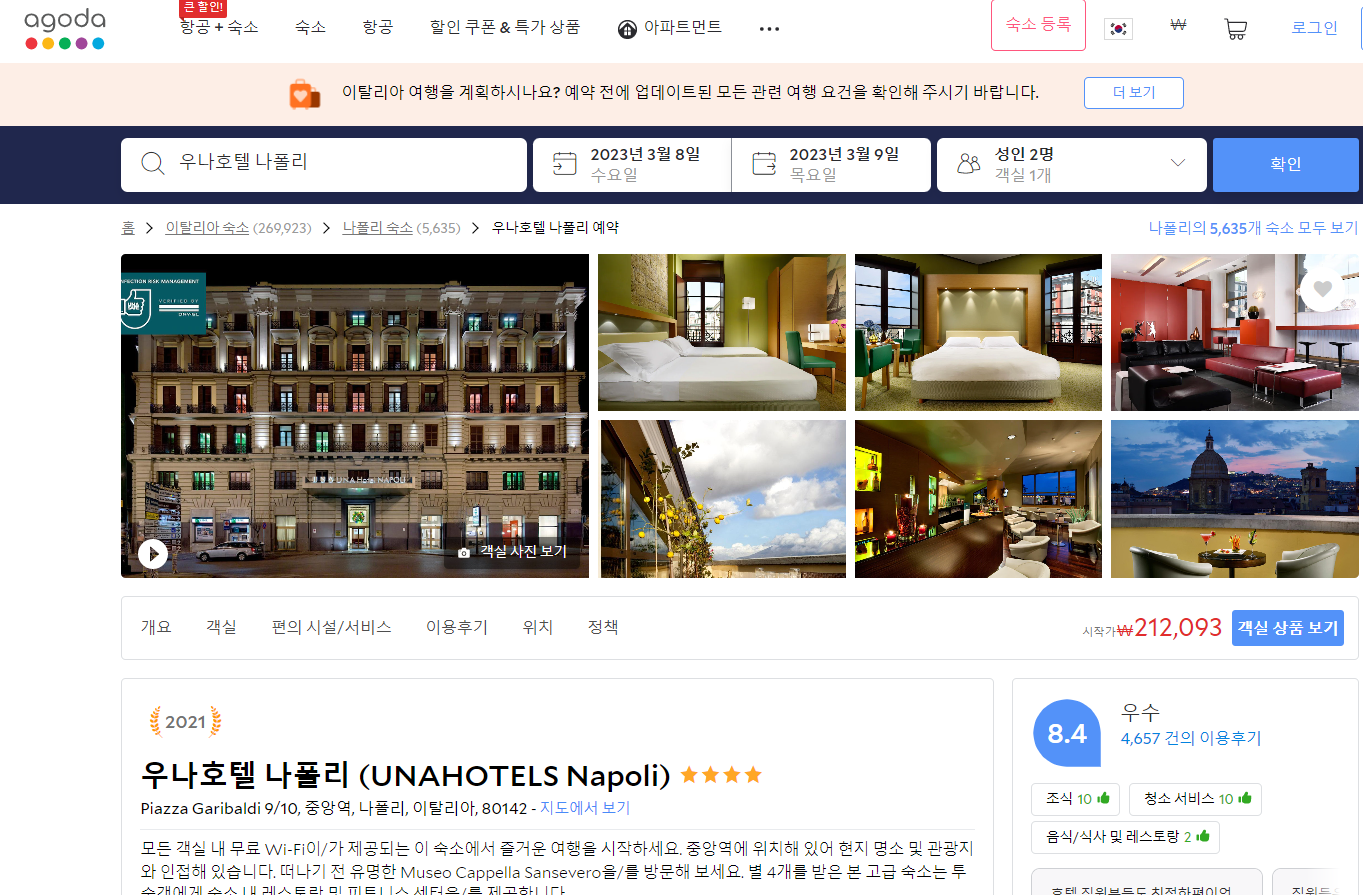 우나호텔 나폴리 (UNAHOTELS Napoli)의 최저 가격대(1박당 요금 - 세금 및 봉사료 포함)는 아고다웹사이트에서 할인특가 가격으로 매일매일 변동되며 10만원대부터 다양하게 형성됩니다. 날짜별로 매일 가격이 다르므로 아고다웹사이트 최저가를 확인하시려면 아래 링크를 누르시고 원하는 날짜의 가격대를 선택해야 정확한 가격을 자세히 보실 수 있습니다.