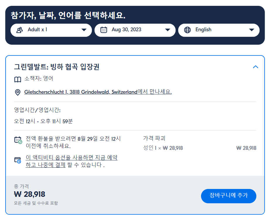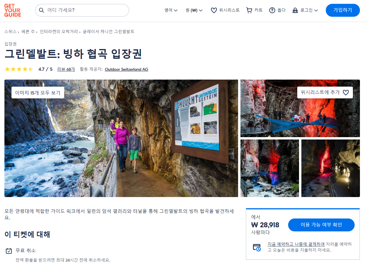 그린델발트 빙하 협곡 입장권(Grindelwald Glacier Canyon Entrance Ticket)은 GET YOUR GUIDE 사이트에서 예약하실 수 있습니다. 사이트는 특히 전세계 대부분의 나라, 지역의 투어, 교통편 있어, 쉽게 찾을 수 없는 여행지의 다양한 투어 및 서비스를 이용할 수 있는 글로벌 사이트로 한국어사이트는 지원하지 않습니다. (글로벌 한국어 여행사이트를 찾으신다면 klook 여행사이트 추천합니다. 함께 사용하시면 더욱 편하게 여행하실 수 있습니다. klook에 찾는 정보가 없다면 GET YOUR GUIDE에서 찾으시면 됩니다.)