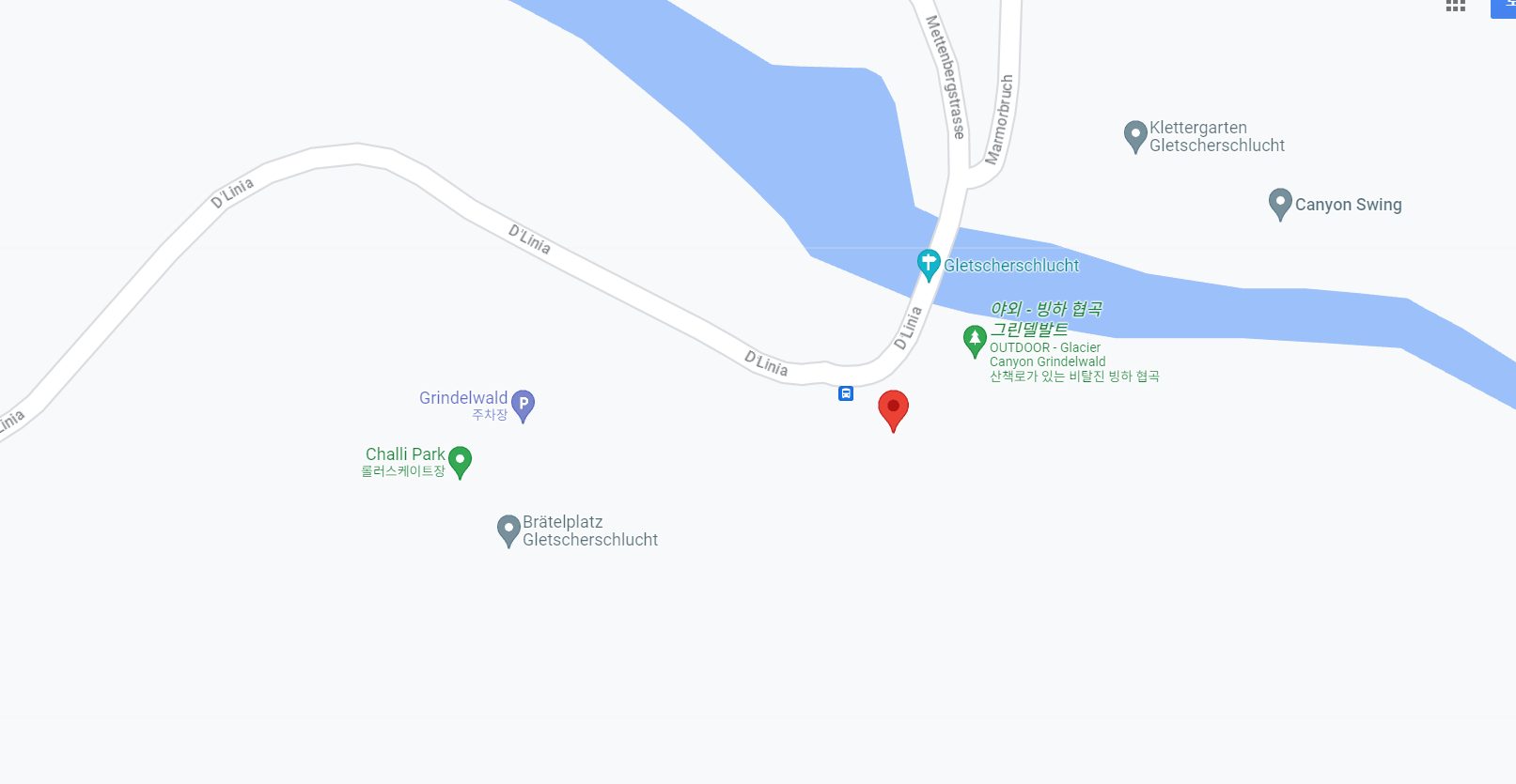 여러 경로를 따라 약 30분이면 시내 중심가에서 Gletscherschlucht까지 걸어갈 수 있습니다. Endweg를 따라 내려가 강을 건너 Erlenpromenade 표지판을 따라 Lütschine을 따라 Gletscherschlucht까지 가는 것이 좋습니다.
