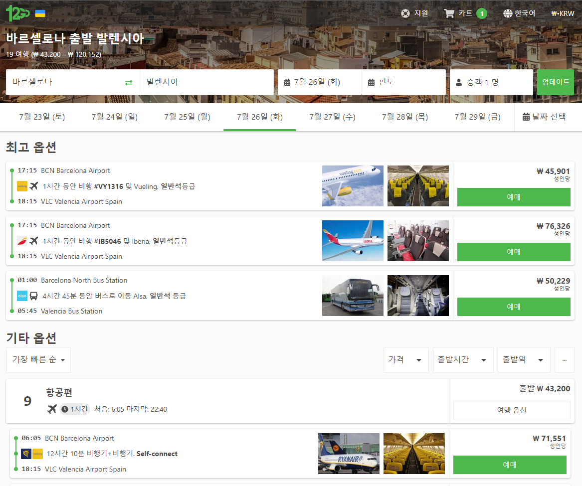 바르셀로나에서 발렌시아로 이동하는 항공은 이동시간 1시간 vueling 항공사 최저요금 45,901원에 이용하실 수 있습니다. iberia 항공사의 7만원대 요금도 있습니다. 비행기는 Barcelona Airport에서 Valencia Airport 로 이동합니다.