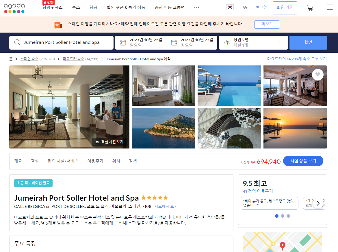 마요르카 주메이라 포트 솔러 호텔 앤 스파(Jumeirah Port Soller Hotel and Spa)의 최저 가격대는 아고다웹사이트에서 할인특가 가격으로 매일매일 변동되며 10만원대부터 다양하게 형성됩니다. 날짜별로 매일 가격이 다르므로 아고다웹사이트 최저가를 확인하시려면 아래 링크를 누르시고 원하는 날짜의 가격대를 선택해야 정확한 가격을 자세히 보실 수 있습니다.