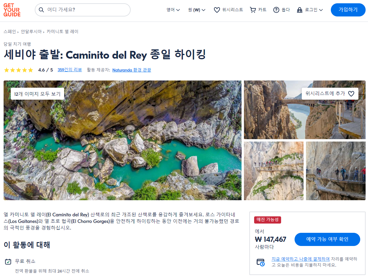 세비야 출발 카미니토 델 레이 하이킹 현지투어 (Caminito del Rey Full-Day Hike From Seville)는 GET YOUR GUIDE 사이트에서 예약하실 수 있습니다. 사이트는 특히 전세계 대부분의 나라, 지역의 투어, 교통편 있어, 쉽게 찾을 수 없는 여행지의 다양한 투어 및 서비스를 이용할 수 있는 글로벌 사이트로 한국어사이트는 지원하지 않습니다. (글로벌 한국어 여행사이트를 찾으신다면 klook 여행사이트 추천합니다. 함께 사용하시면 더욱 편하게 여행하실 수 있습니다. klook에 찾는 정보가 없다면 GET YOUR GUIDE에서 찾으시면 됩니다.)