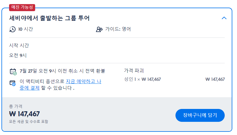 최소 인원이 충족되지 않으면 투어가 취소될 수 있습니다.