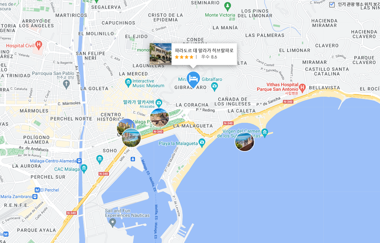 관광지와 가깝고 파라도르를 올라가는 길에 지중해 전망이 인상에 많이 남습니다. 휴양지로 잘 가꿔진 말라가 시내에서의 관광 및 쇼핑도 좋았습니다. 지중해와 말라가 시내를 바라보며 휴식을 취할 수 있는 호텔로서 가격도 적당하고 관광지와의 접근성도 좋습니다.