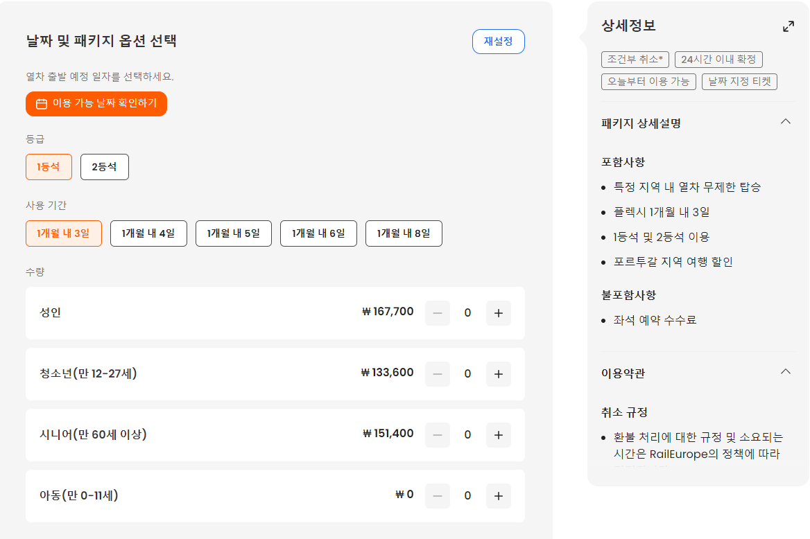 다양한 옵션: 유레일 포르투갈 패스는 여행자의 필요와 여행 스타일에 맞게 다양한 옵션을 제공합니다. 여행 기간, 좌석 등급, 여행자의 나이(어린이, 청소년, 성인, 시니어)에 따라 선택할 수 있는 다양한 패스 타입이 있습니다.