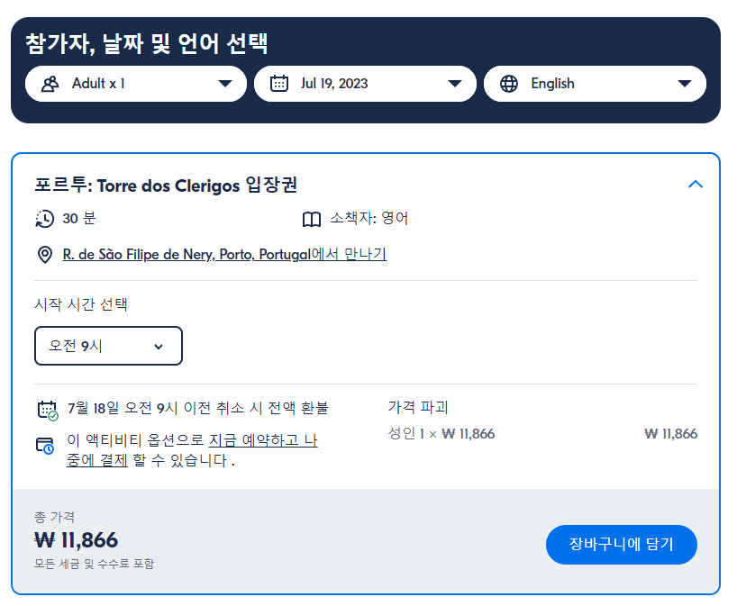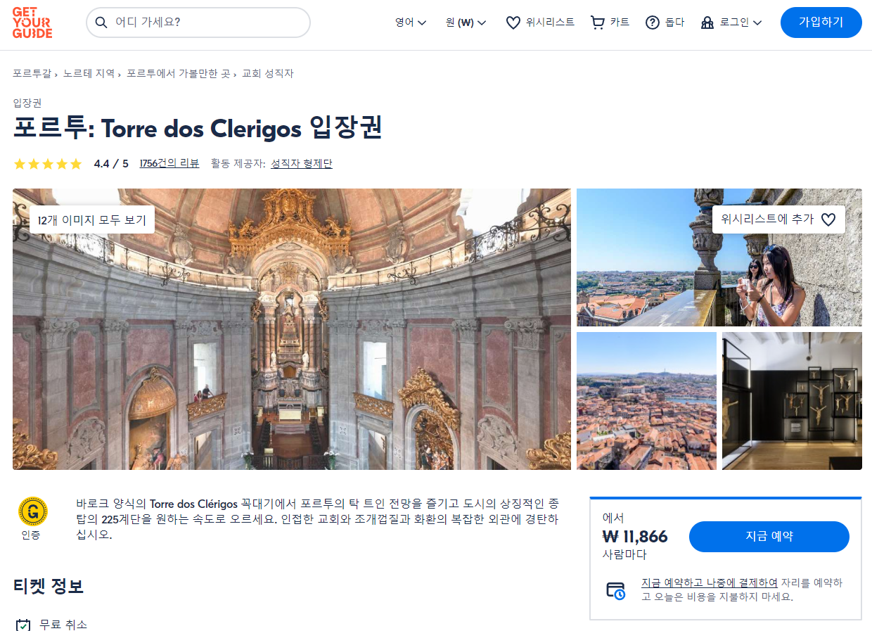 포르투 토레 도스 클레리고스 입장권(Porto Torre dos Clerigos Entrance Ticket)은 GET YOUR GUIDE 사이트에서 예약하실 수 있습니다. 사이트는 특히 전세계 대부분의 나라, 지역의 투어, 교통편 있어, 쉽게 찾을 수 없는 여행지의 다양한 투어 및 서비스를 이용할 수 있는 글로벌 사이트로 한국어사이트는 지원하지 않습니다. (글로벌 한국어 여행사이트를 찾으신다면 klook 여행사이트 추천합니다. 함께 사용하시면 더욱 편하게 여행하실 수 있습니다. klook에 찾는 정보가 없다면 GET YOUR GUIDE에서 찾으시면 됩니다.)