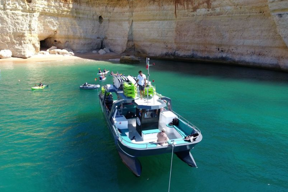 Benagil 투어를 시작하고 특수 제작된 보트를 타고 Albufeira Marina에서 출발합니다. 40분 동안 보트를 타고 항해하면서 해안선의 멋진 전망을 즐기다가 멈춰서 카약이나 SUP로 갈아타세요.