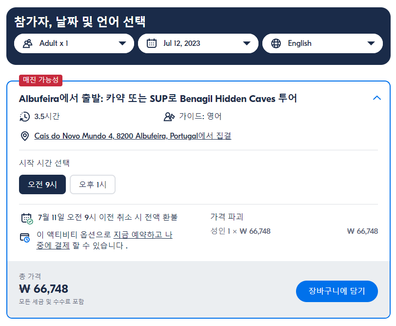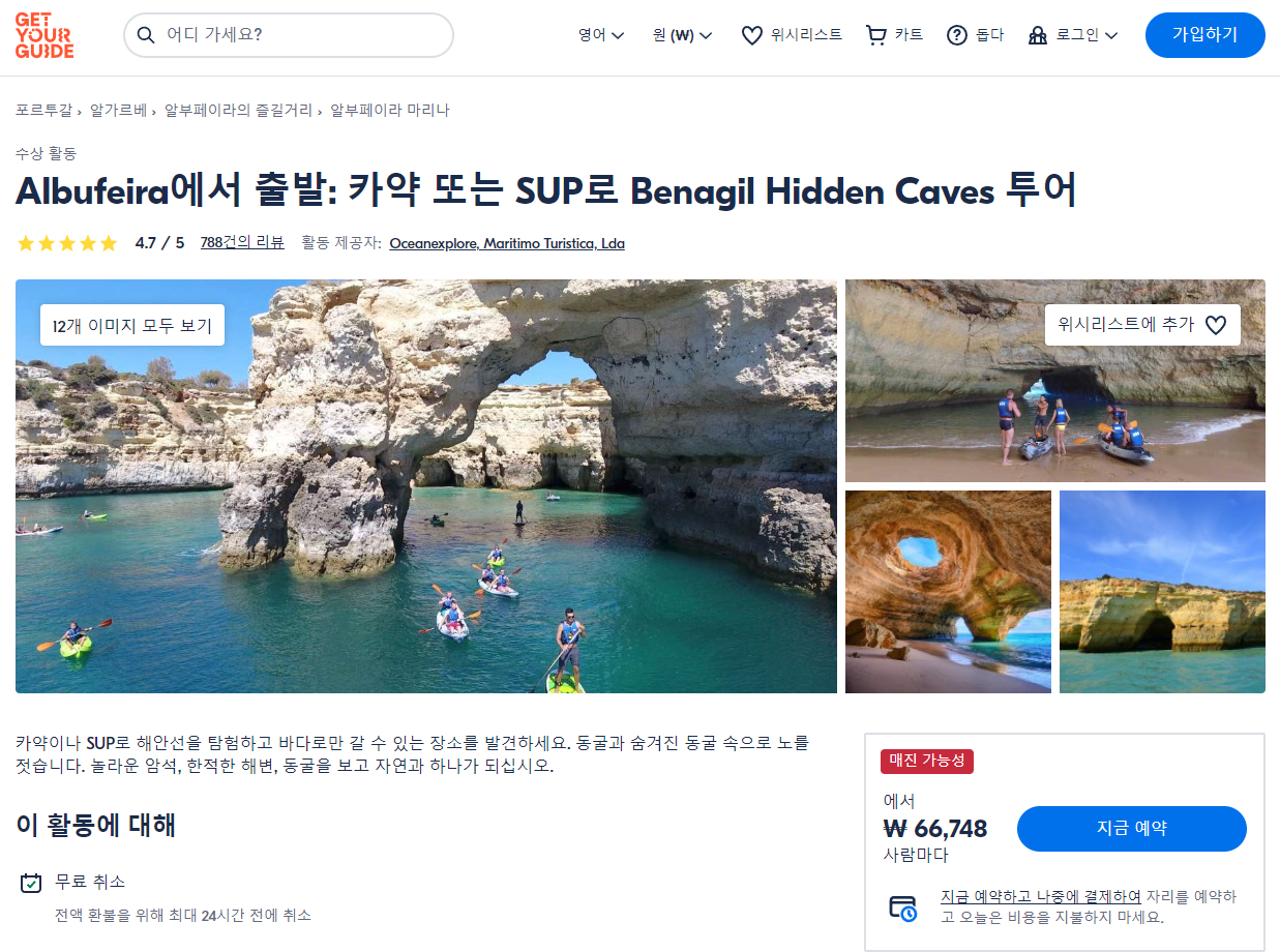 알부페이라출발 카약 또는 SUP로 베나길 숨겨진 동굴 투어 (Benagil Hidden Caves Tour by Kayak or SUP From Albufeira)는 GET YOUR GUIDE 사이트에서 예약하실 수 있습니다. 사이트는 특히 전세계 대부분의 나라, 지역의 투어, 교통편 있어, 쉽게 찾을 수 없는 여행지의 다양한 투어 및 서비스를 이용할 수 있는 글로벌 사이트로 한국어사이트는 지원하지 않습니다. (글로벌 한국어 여행사이트를 찾으신다면 klook 여행사이트 추천합니다. 함께 사용하시면 더욱 편하게 여행하실 수 있습니다. klook에 찾는 정보가 없다면 GET YOUR GUIDE에서 찾으시면 됩니다.)
