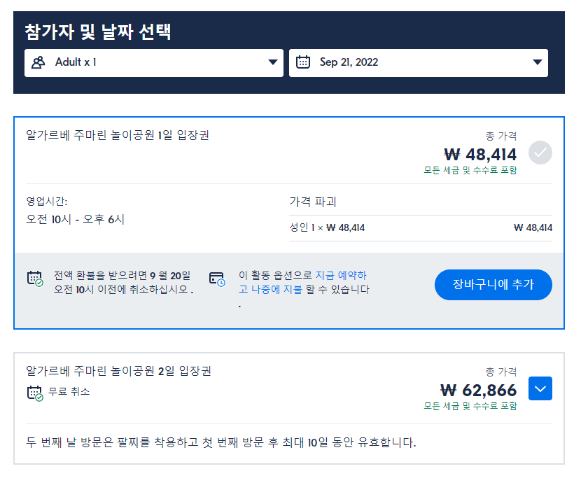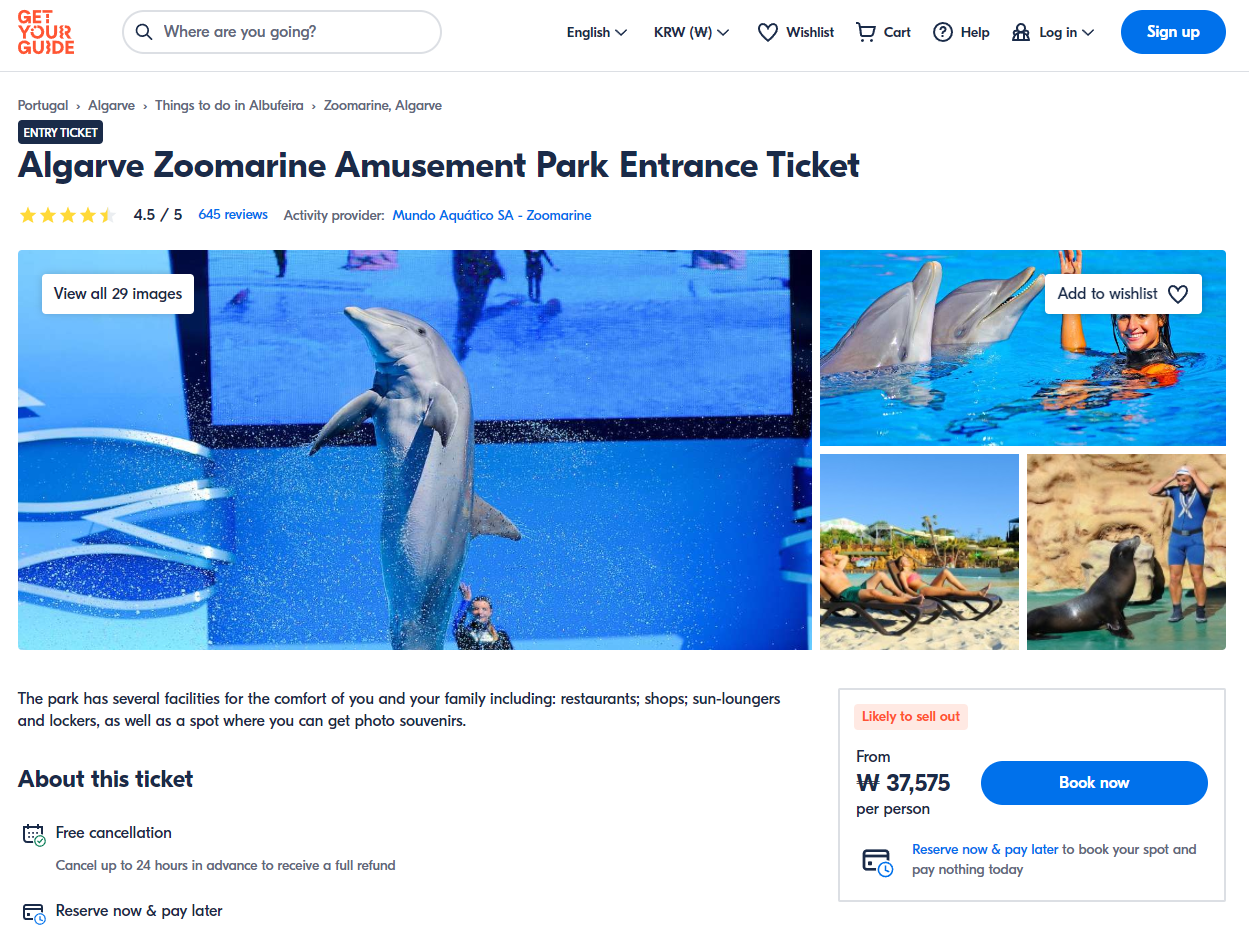 알가르베 줌마린 놀이공원 (Algarve Zoomarine) 입장권은 GET YOUR GUIDE 사이트에서 예약하실 수 있습니다. 사이트는 특히 전세계 대부분의 나라, 지역의 투어, 교통편 있어, 쉽게 찾을 수 없는 여행지의 다양한 투어 및 서비스를 이용할 수 있는 글로벌 사이트로 한국어사이트는 지원하지 않습니다. (글로벌 한국어 여행사이트를 찾으신다면 klook 여행사이트 추천합니다. 함께 사용하시면 더욱 편하게 여행하실 수 있습니다. klook에 찾는 정보가 없다면 GET YOUR GUIDE에서 찾으시면 됩니다.)
