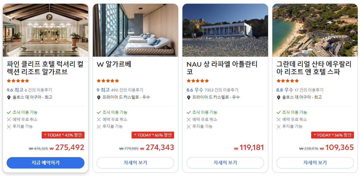 알부페이라 파인 클리프 호텔 럭셔리 컬렉션 리조트 알가르브 (Pine Cliffs Hotel, a Luxury Collection Resort, Algarve)의 최저 가격대는 아고다웹사이트에서 할인특가 가격으로 매일매일 변동되며 20~30만원대부터 다양하게 형성됩니다. 날짜별로 매일 가격이 다르므로 아고다웹사이트 최저가를 확인하시려면 아래 링크를 누르시고 원하는 날짜의 가격대를 선택해야 정확한 가격을 자세히 보실 수 있습니다.