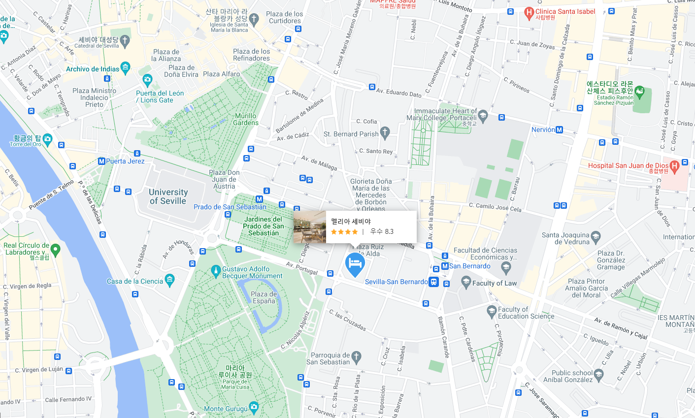스페인 세비야여행의 분위기좋은 호텔 멜리아 세비야 (Melia Sevilla)는 새로 개조된 넓은 객실, 좋은 아침 식사, 위치는 주요 교통 역과 가까우며 가장 중요한 관광 명소는 도보로 이동할 수 있는 범위 내에 있습니다. Placa España 건너편의 훌륭한 위치이며 트램 정류장과 구내 주차장에 쉽게 접근할 수 있습니다.. 기본 편의 시설이 있는 편의점이 근처에 있습니다. 호텔은 조용하고 깔끔하며 광장이랑도 가깝고 론다갈때 버스타고 갈 터미널도 가깝고 걸어서 가능한거리입니다.