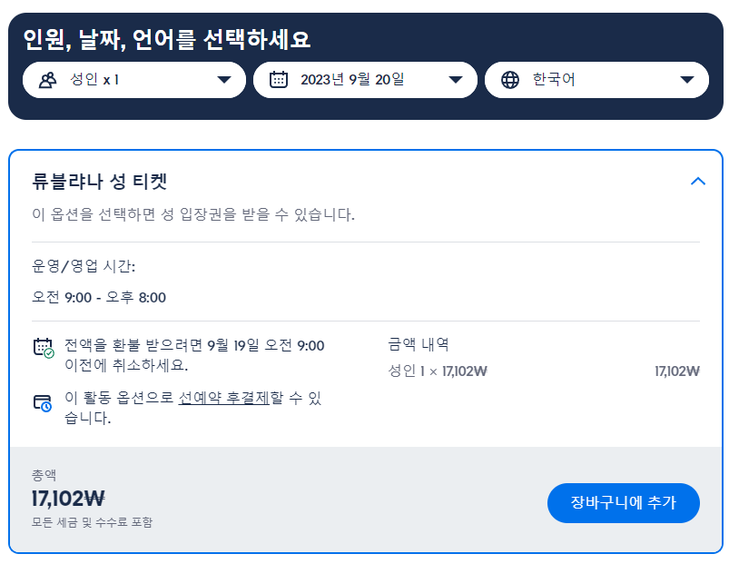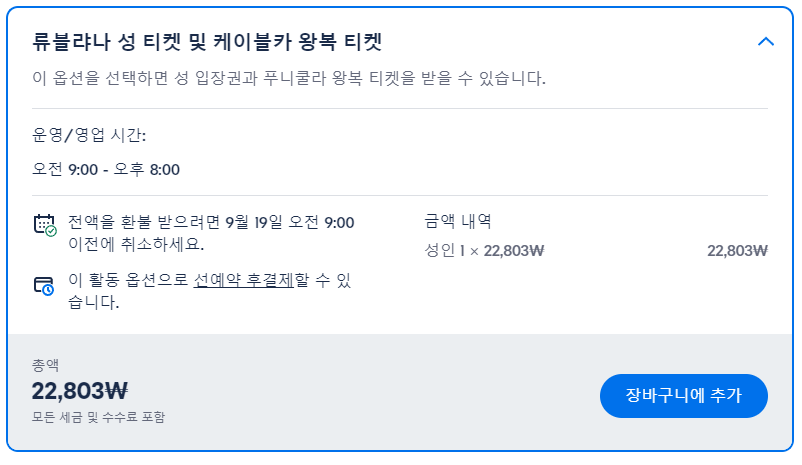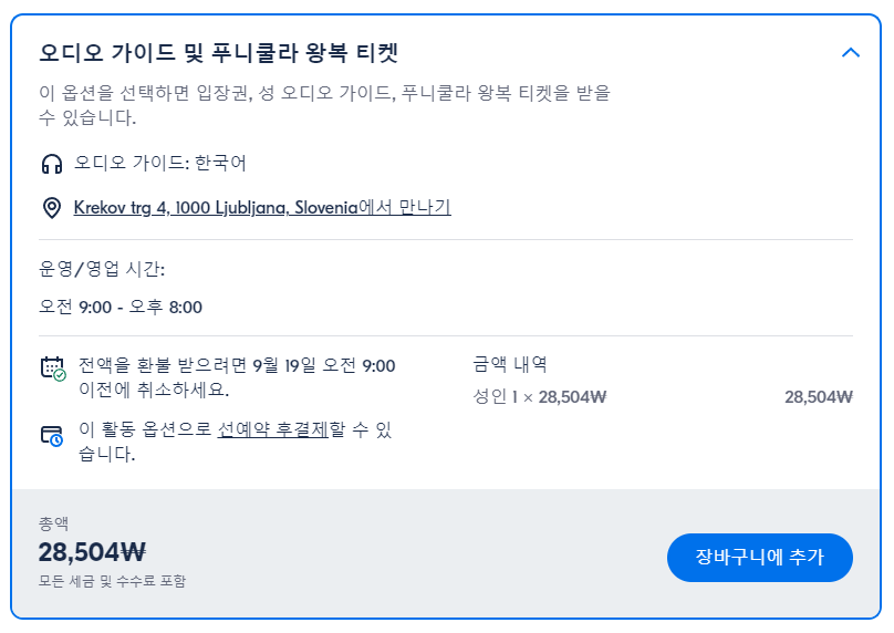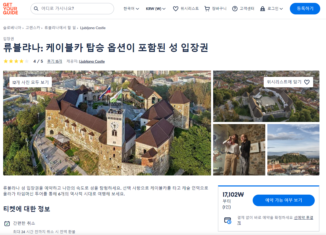 류블랴나 케이블카 탑승 옵션이 포함된 류블랴나성 입장권은 GET YOUR GUIDE 사이트에서 예약하실 수 있습니다. 사이트는 특히 전세계 대부분의 나라, 지역의 투어, 교통편 있어, 쉽게 찾을 수 없는 여행지의 다양한 투어 및 서비스를 이용할 수 있는 글로벌 사이트로 한국어사이트는 지원하지 않습니다. (글로벌 한국어 여행사이트를 찾으신다면 klook 여행사이트 추천합니다. 함께 사용하시면 더욱 편하게 여행하실 수 있습니다. klook에 찾는 정보가 없다면 GET YOUR GUIDE에서 찾으시면 됩니다.)