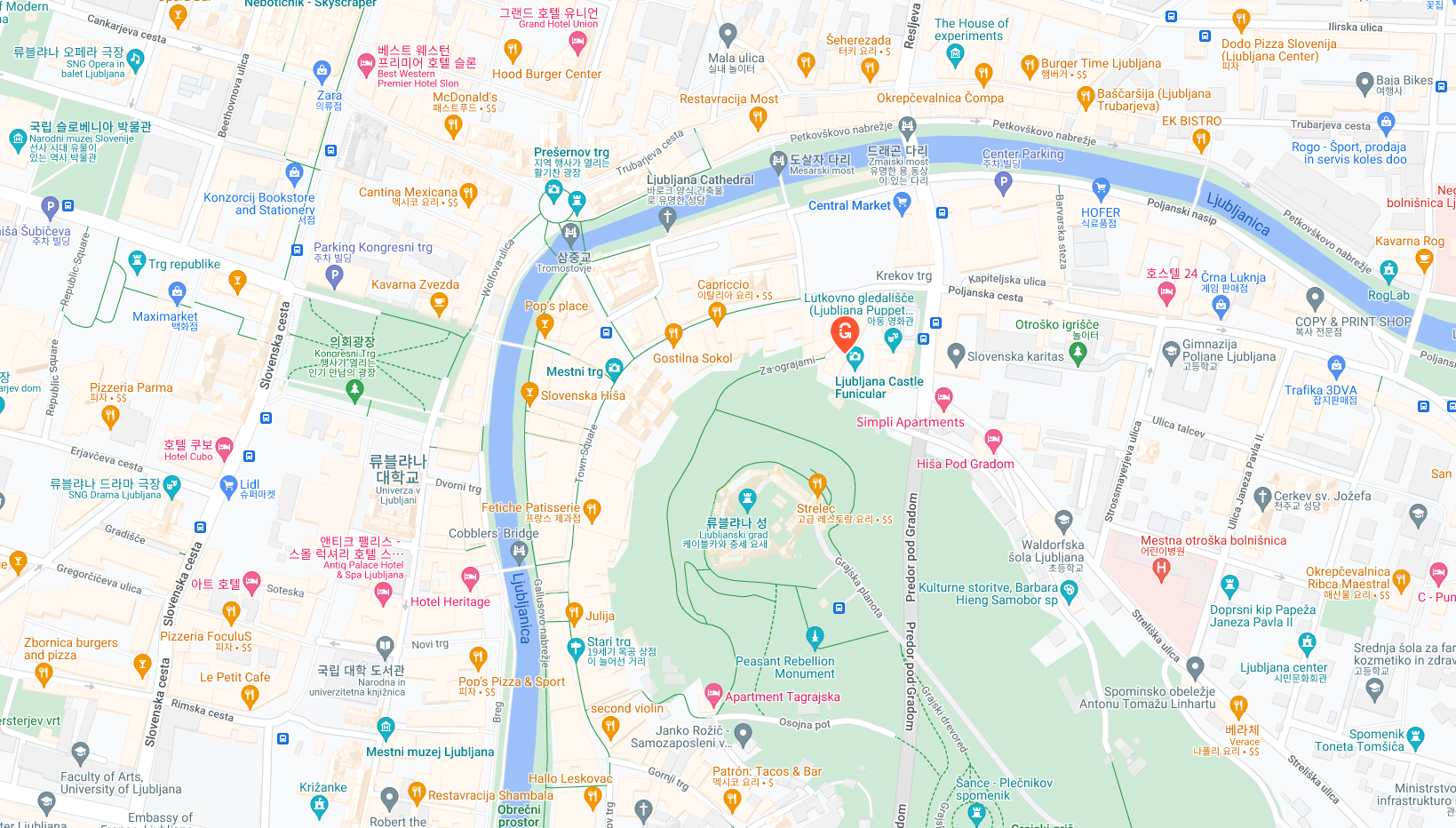 다국어 오디오 가이드를 선택해 성이 수세기 동안 어떤 중요한 역할을 했는지 알아보세요. 캐슬 언덕까지 가파른 오르막길을 피하고 싶다면 구시가지에서 유리로 둘러싸인 류블랴나 성 푸니쿨라를 타고 조금만 올라가면 됩니다.