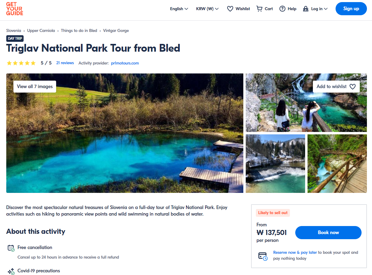 블레드출발 트리글라브 국립공원(Triglav national park) 투어 GET YOUR GUIDE 사이트에서 예약하실 수 있습니다. 사이트는 특히 전세계 대부분의 나라, 지역의 투어, 교통편 있어, 쉽게 찾을 수 없는 여행지의 다양한 투어 및 서비스를 이용할 수 있는 글로벌 사이트로 한국어사이트는 지원하지 않습니다. (글로벌 한국어 여행사이트를 찾으신다면 klook 여행사이트 추천합니다. 함께 사용하시면 더욱 편하게 여행하실 수 있습니다. klook에 찾는 정보가 없다면 GET YOUR GUIDE에서 찾으시면 됩니다.)
