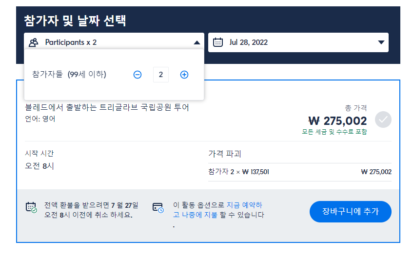 최소 숫자가 적용됩니다. 이러한 요구 사항을 충족하는 승객이 충분하지 않은 경우 확인 후 취소될 수 있습니다. 이 경우 대체 또는 전액 환불이 제공됩니다.