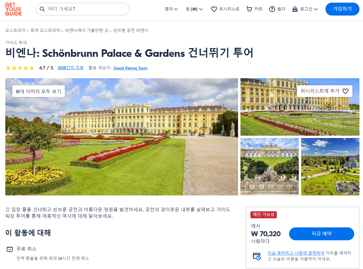 비엔나 쇤브룬궁전과 정원 바로 입장 투어(Vienna Schönbrunn Palace & Gardens Skip-the-Line Tour)는 GET YOUR GUIDE 사이트에서 예약하실 수 있습니다. 사이트는 특히 전세계 대부분의 나라, 지역의 투어, 교통편 있어, 쉽게 찾을 수 없는 여행지의 다양한 투어 및 서비스를 이용할 수 있는 글로벌 사이트로 한국어사이트는 지원하지 않습니다. (글로벌 한국어 여행사이트를 찾으신다면 klook 여행사이트 추천합니다. 함께 사용하시면 더욱 편하게 여행하실 수 있습니다. klook에 찾는 정보가 없다면 GET YOUR GUIDE에서 찾으시면 됩니다.)