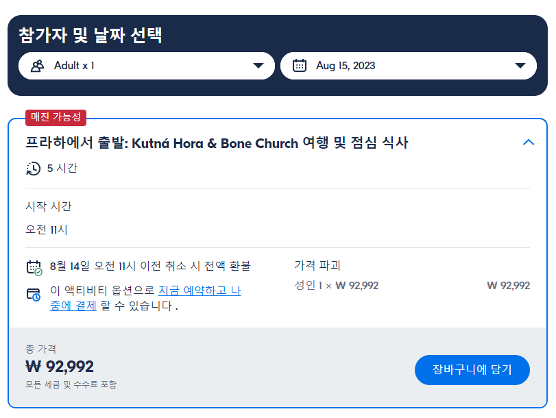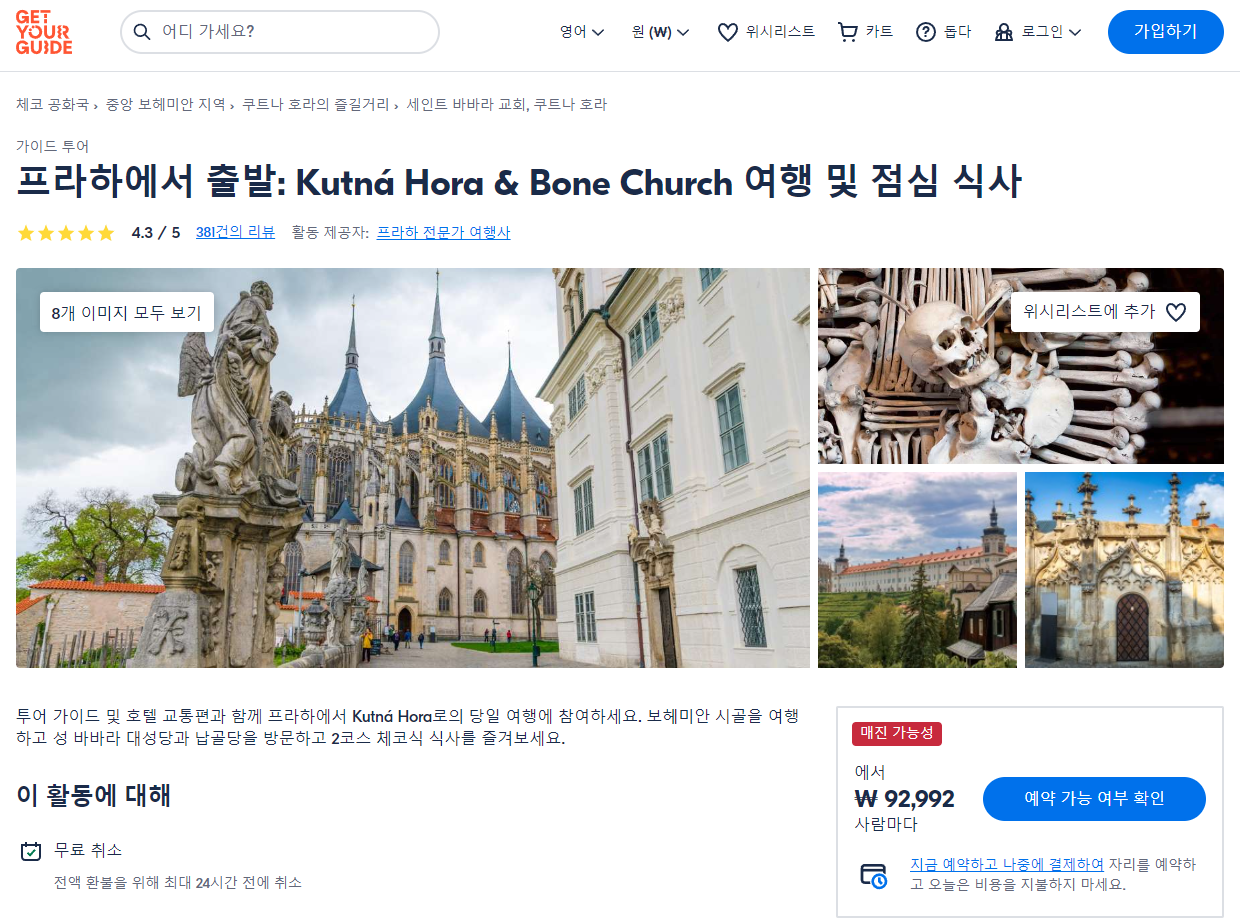 프라하출발 쿠트나 호라 & Bone Church 여행 및 점심 식사(Kutná Hora & Bone Church Excursion with Lunch From Prague) 현지투어는 GET YOUR GUIDE 사이트에서 예약하실 수 있습니다. 사이트는 특히 전세계 대부분의 나라, 지역의 투어, 교통편 있어, 쉽게 찾을 수 없는 여행지의 다양한 투어 및 서비스를 이용할 수 있는 글로벌 사이트로 한국어사이트는 지원하지 않습니다. (글로벌 한국어 여행사이트를 찾으신다면 klook 여행사이트 추천합니다. 함께 사용하시면 더욱 편하게 여행하실 수 있습니다. klook에 찾는 정보가 없다면 GET YOUR GUIDE에서 찾으시면 됩니다.)