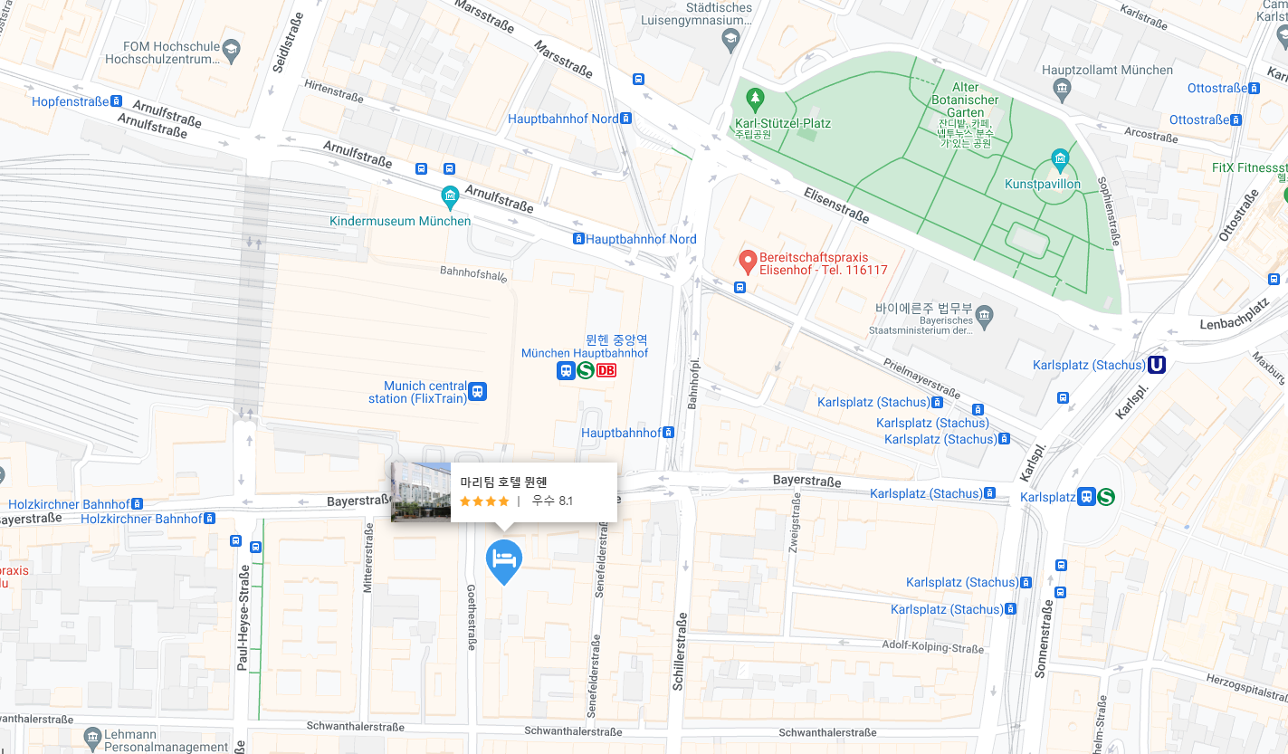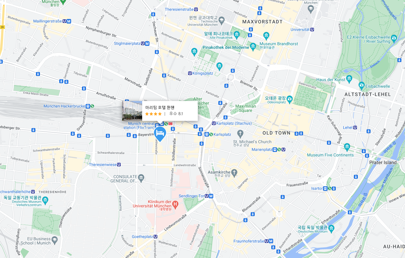 독일 뮌헨여행에 추천하는 마리팀 호텔 뮌헨 (Maritim Hotel Munich)은 중앙 기차역에서 도보로 7분 거리에 있는 매우 멋진 호텔입니다. 기차역 근처에 있어 도보 이동이 많습니다. 나는 밤에 걸어 다니는 것이 안전하다고 느낄 수 있는 분위기로 주변의 많은 멋진 레스토랑과 뮌헨에 있는 대부분의 명소까지 도보 거리 내에 있습니다. 올드타운까지 도보로 약 7분 거리입니다. (특히 뮌헨과 같은 아름다운 도시에서 걷는 것은 괜찮습니다)