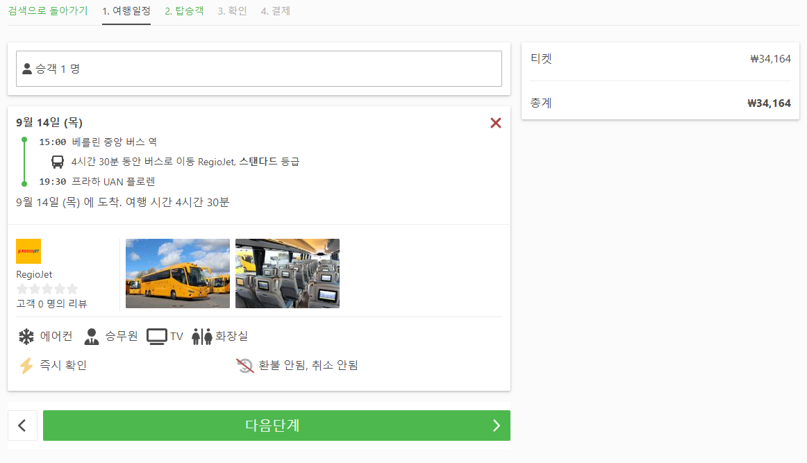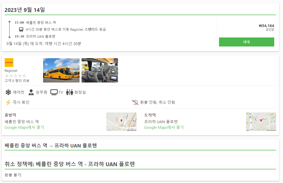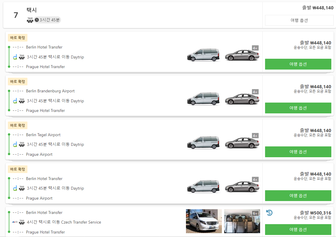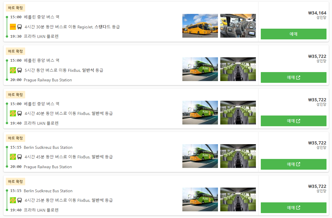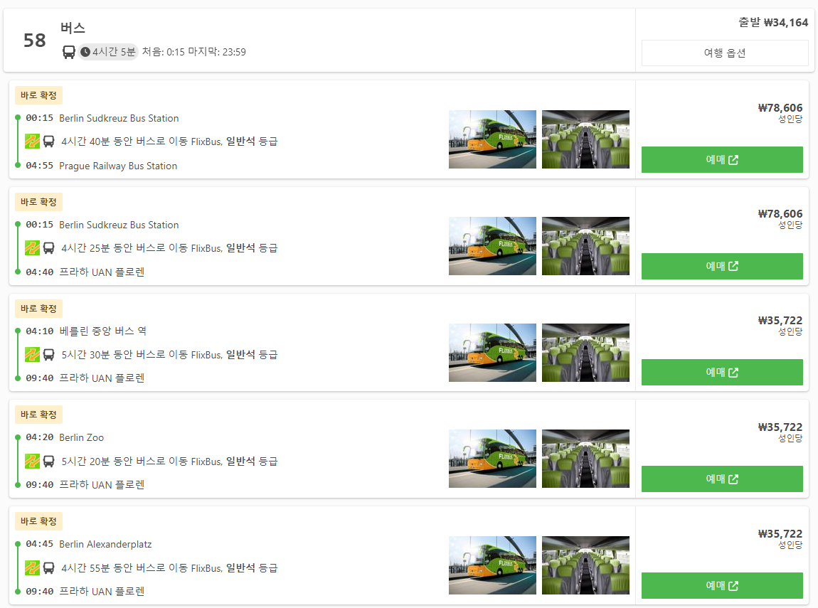 베를린에서 프라하로 가는 버스는 하루종일 24시간 있어서 원하는 시간대를 선택하면 되지만 시간대별로 가격차이가 3만원대부터 7만원대까지 있어서 저렴한 시간대를 선택하시는 것을 추천드립니다. 최저이동시간은 최저 4시간 14분부터입니다. 참고로 택시도 온라인으로 예약이가능하며 40만원대입니다.