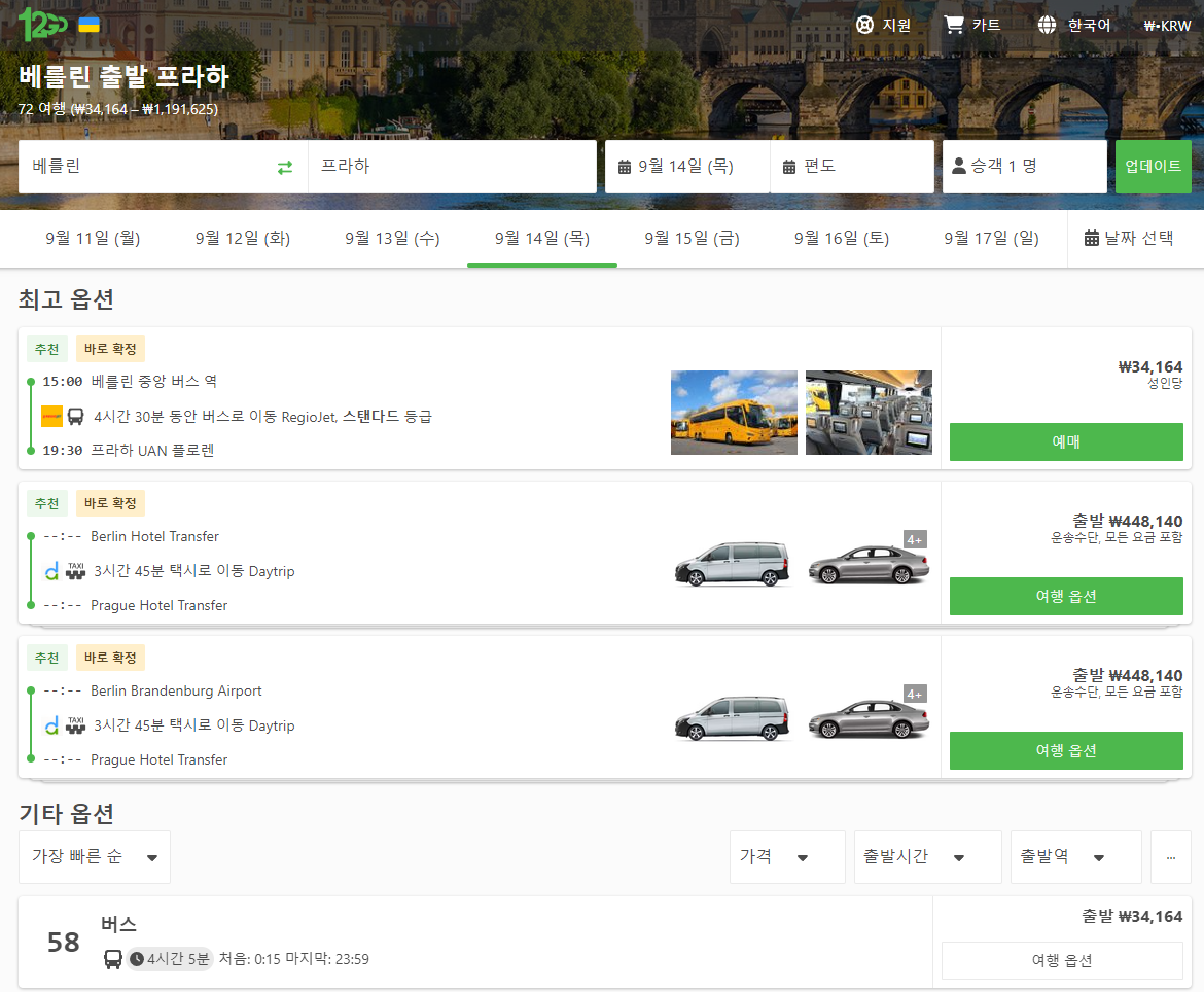 베를린에서 프라하로 이동하는 교통편 노선정보 및 예약은 12go사이트에서 예약하실 수 있으며, 이 노선 뿐만아니라 나라전역의 노선, 나라간 노선의 검색가능한 모든 교통편을 검색하고 예약하실 수 있습니다. 한국어로 검색해보시고 나오지 않으면 영어로 검색하시면 보다 쉽게 노선을 확인하실 수 있습니다.