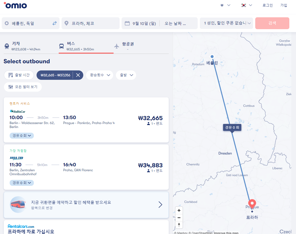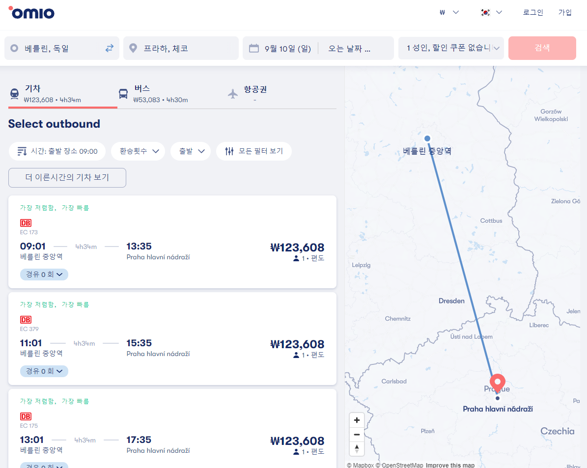 OMIO 사이트에서 베를린에서 프라하로 이동하는