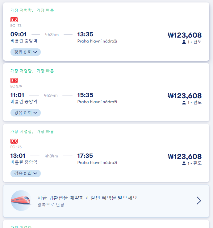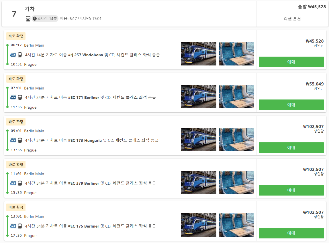 베를린에서 프라하로 가는 기차도 4시간 14분이상 소요되며 하루 7편정도 있고 요금은 최저 4만원대부터입니다.
